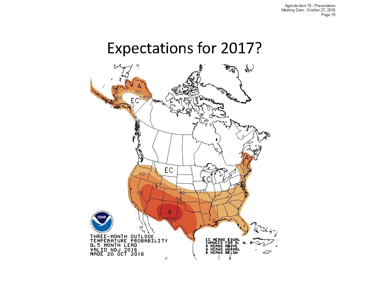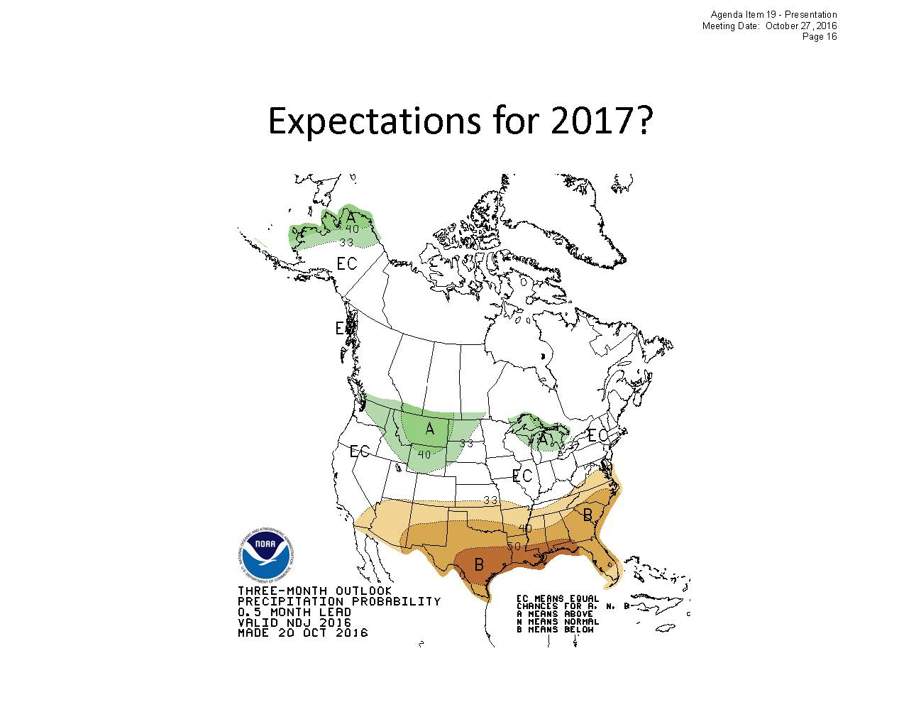The current outlook for the next three months from NOAA are for warmer conditions for California and much of the country; the expectations for 2017 for precipitation is a La Nina condition, which typically means drier conditions in the south; the outlook is for equal chances, he said.