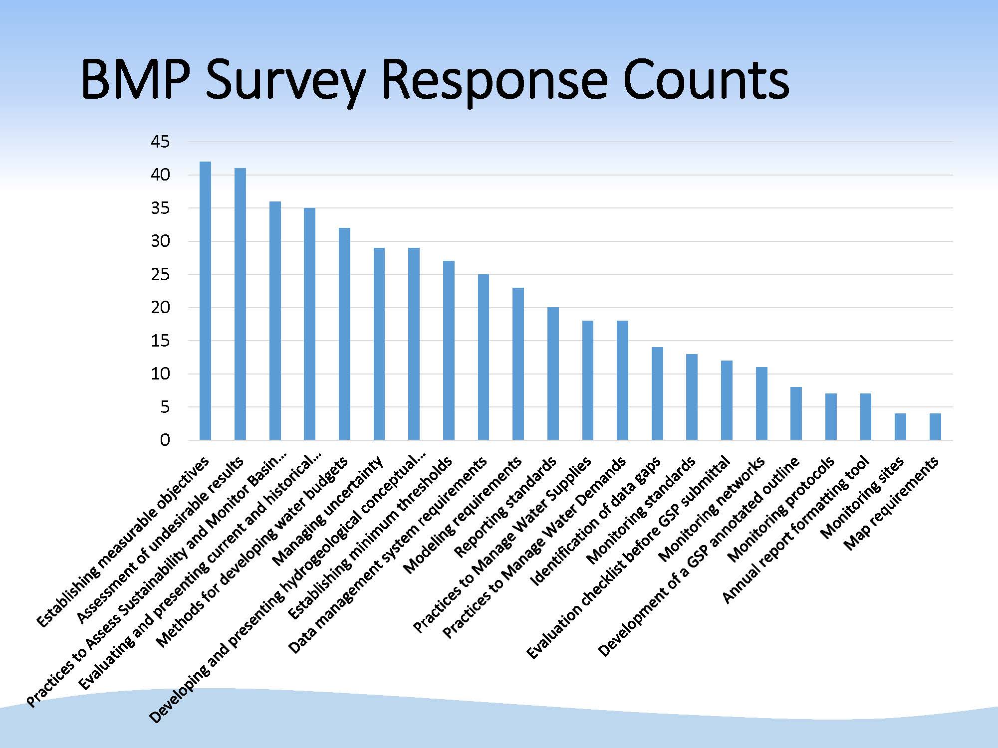 “The technical items that we prepared in the BMPs, including water budget and monitoring, were the highest ranked topics by local agencies and survey respondents, as well as some of the most challenging aspects of SGMA, such as how to approach undesirable results, measurable objectives, and minimum thresholds,” Mr. Joseph said.