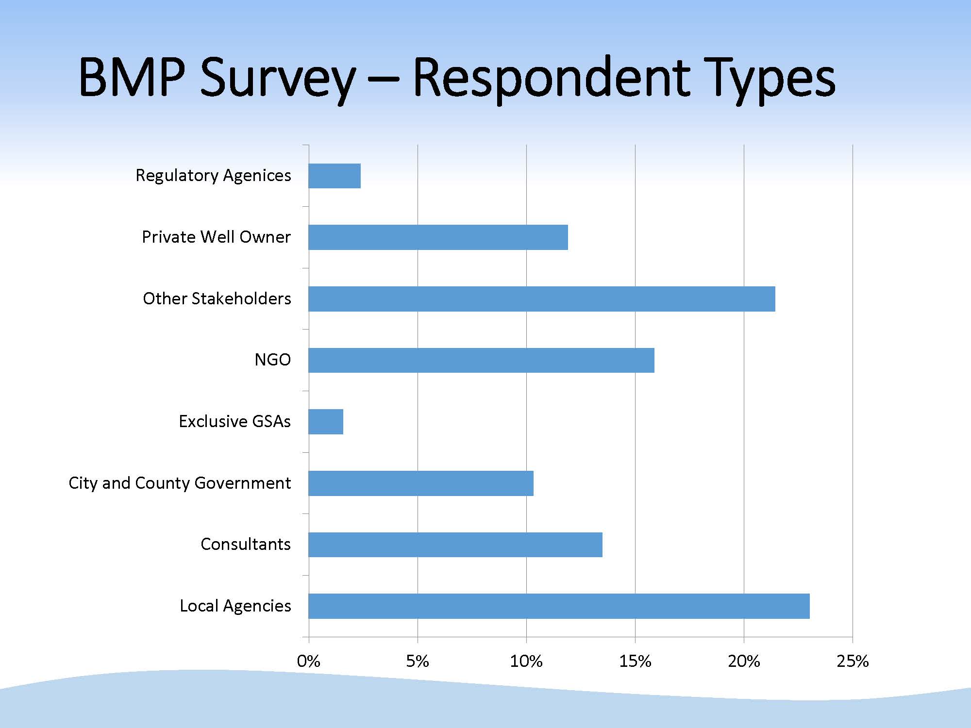 Mr. Joseph said that due to time limitations, they weren’t able to hold as many meetings with advisory groups and stakeholders as they did on the regulations, so they used the surrogate of the survey to garner input from folks on the topics for development of the best management practices. There was a good distribution of respondents that included local agencies, private well owners, city and county governments, practitioners, and other stakeholders.