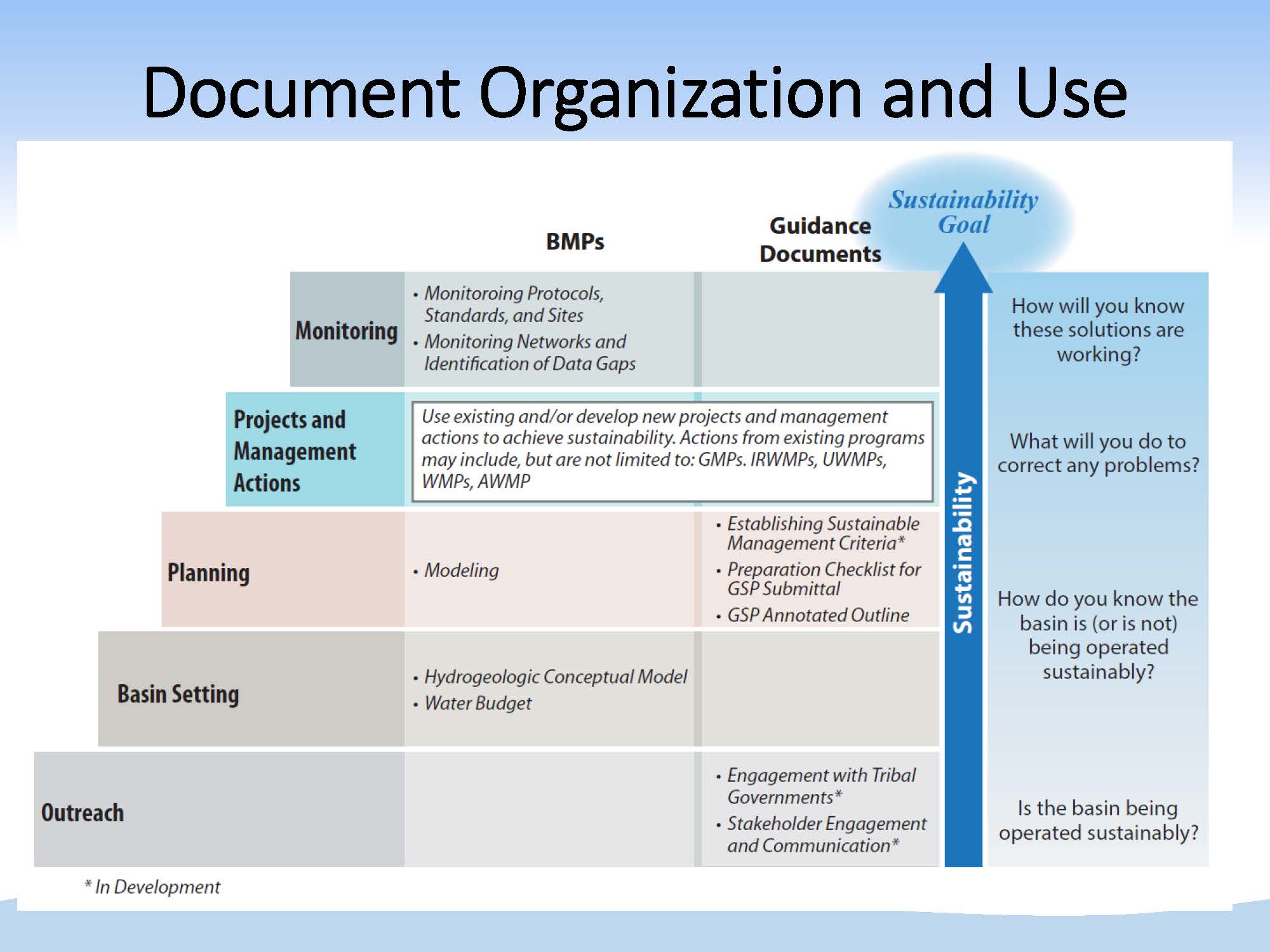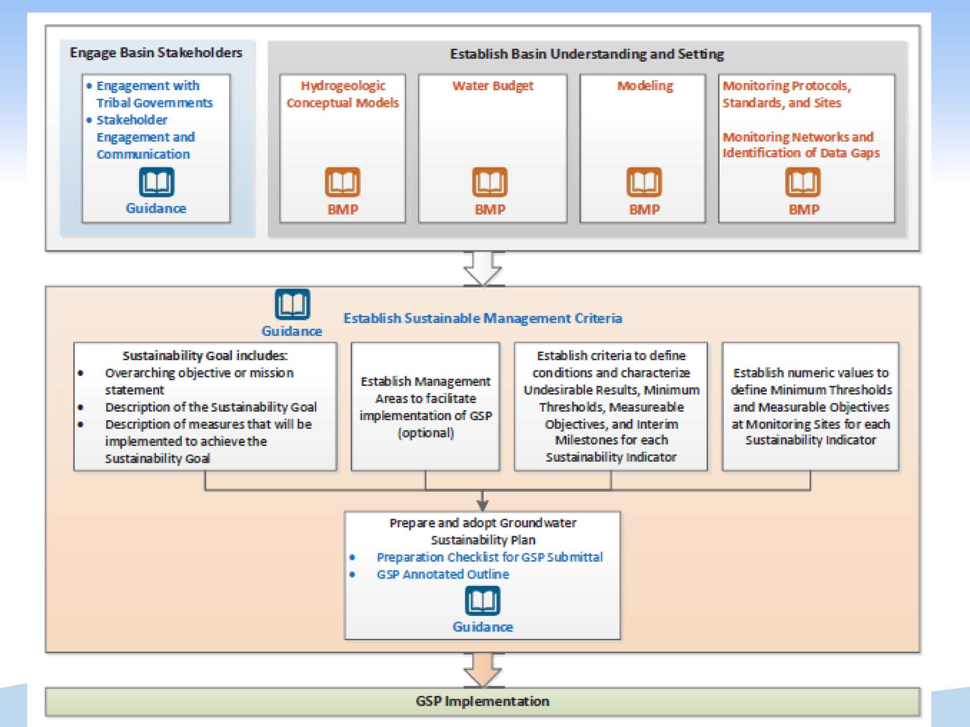 The Department has also posted a four page framework document that is intended to provide information on how to utilize the BMPs and explain how the BMPs fit together in terms of how to approach GSP development.