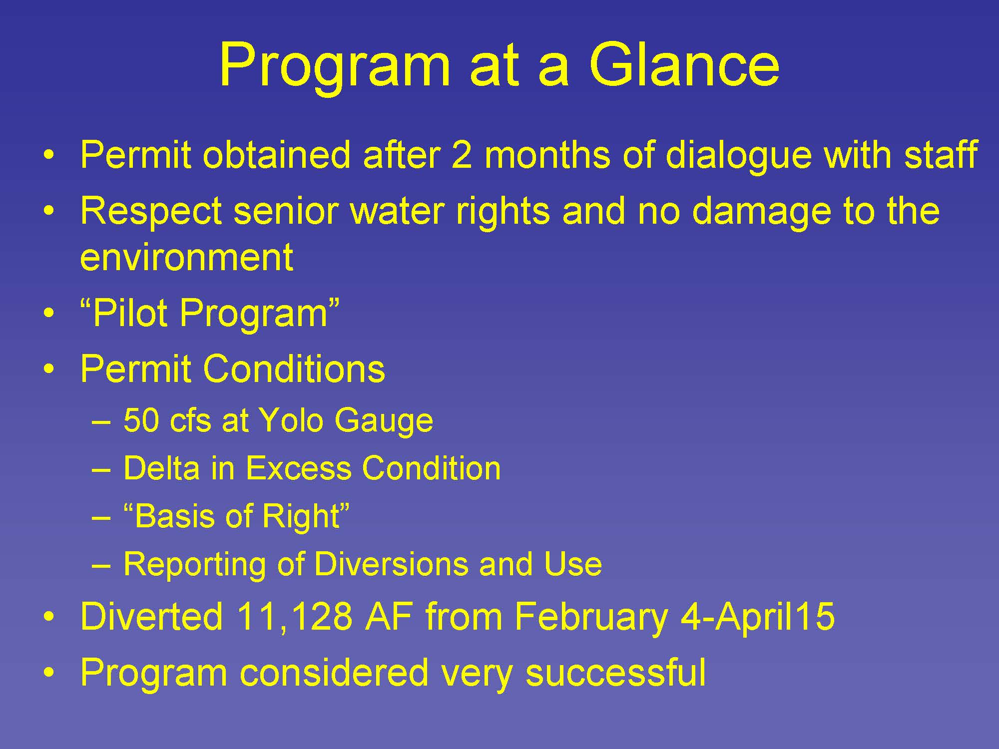 Another question that arose is when the parties submitting an application is not the party that will actually be using the water. This was the case for Yolo County Flood Control’s project, as well as Eastside Water District. The districts were the permittees, but the users were private well owners within the district’s service areas.
