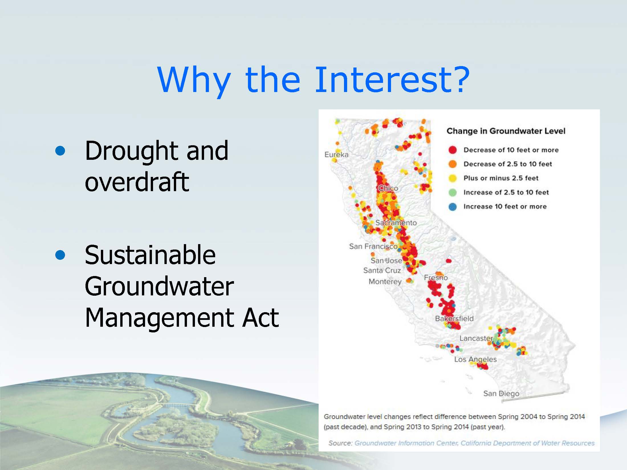 Ms. Montgomery noted that in addition to the drought, the implementation of the Sustainable Groundwater Management Act will likely increase interest in these types of projects. “Some of these local agencies may be looking for solutions and this temporary permit or even standard permit will be one of the things they may look at,” she said. “The deadlines for the SGMA plans are 2020 and 2022 for the high and medium basins, so it that’s a little further out.”