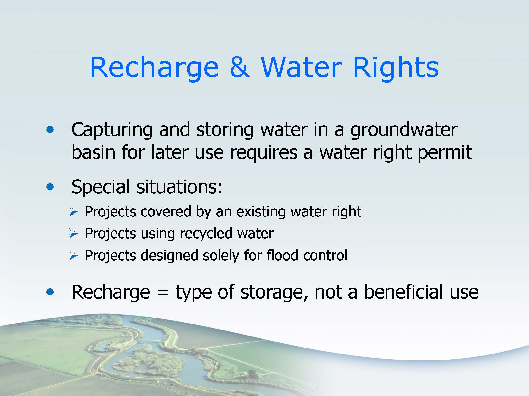 - Click here for the State Water Resources Control Board’s webpage on groundwater recharge permits.