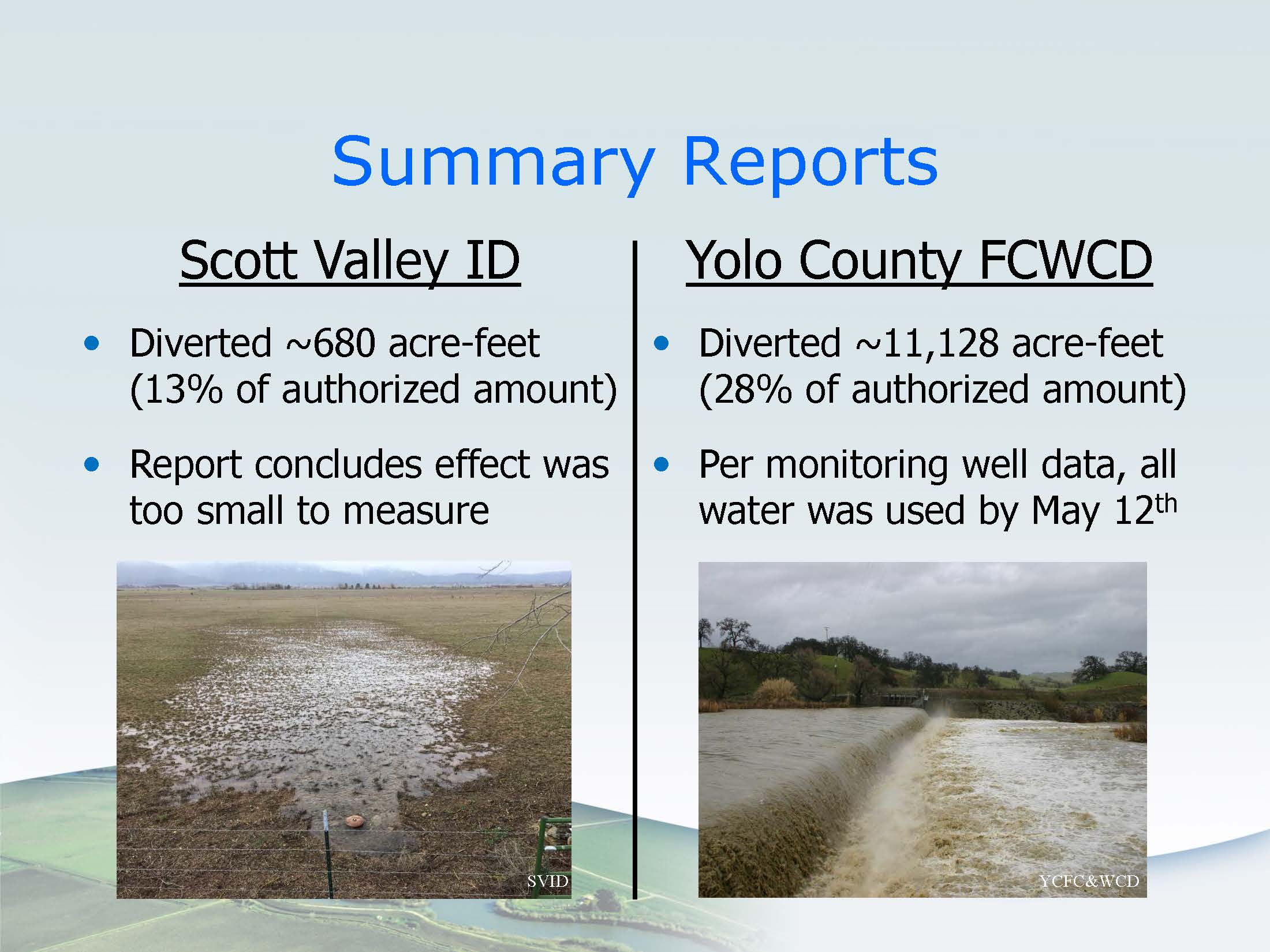 Both the Scott Valley Irrigation District and Yolo County Flood Control submitted summary reports in late September, early October as required in their temporary permits; the summary reports described how much water the permittees diverted, how much water was put to use, and how they measured or estimated beneficial use.
