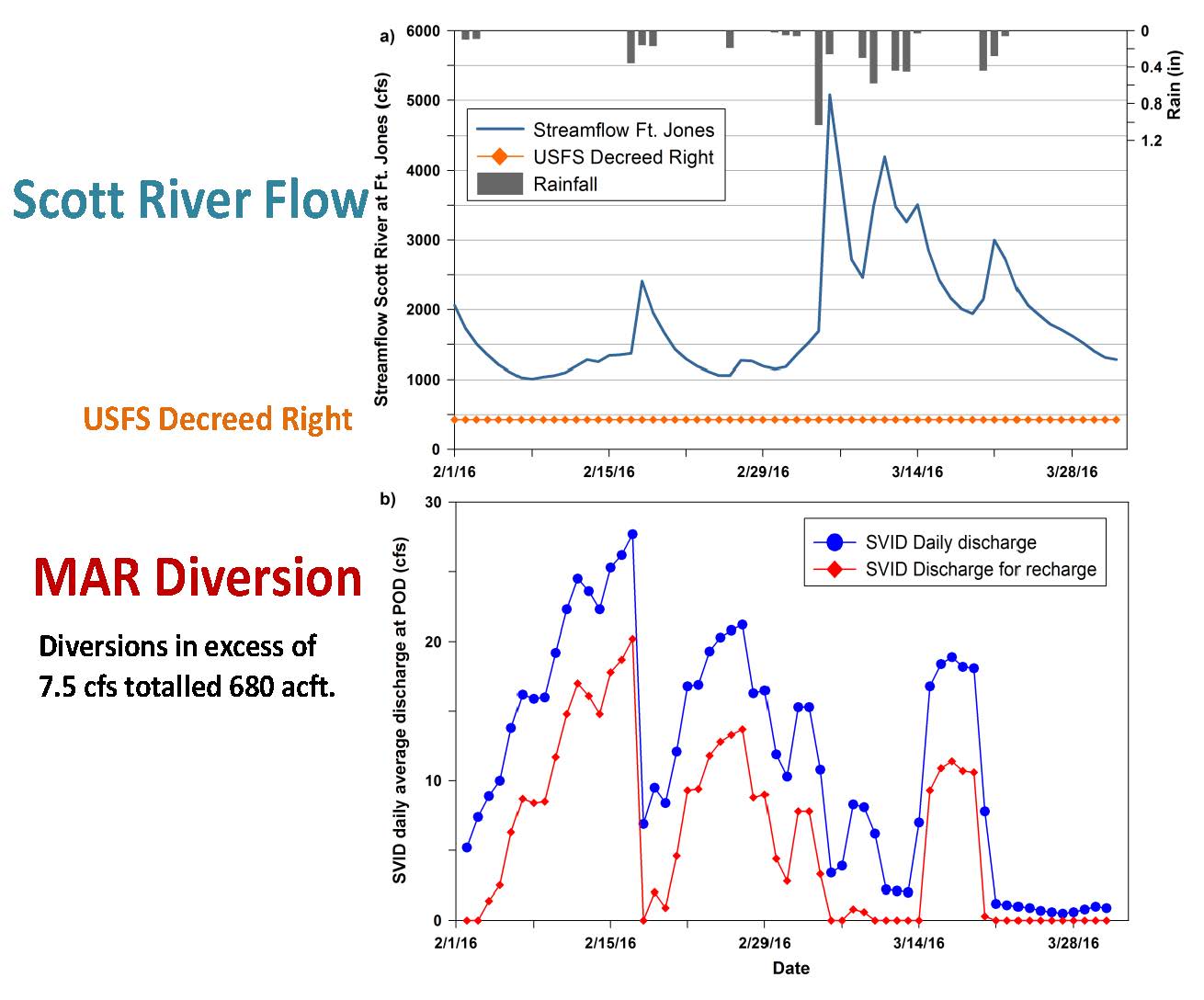 The water diversion was almost 6 cfs on average over a 2 month period; the Scott Valley River was never below 1000 cfs and at times exceeded 5000 cfs, so it was a relatively small amount diverted for the recharge process.