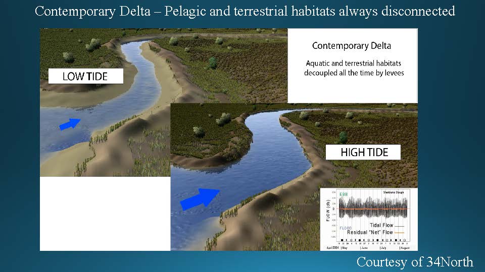 In the contemporary Delta with all the levees, the pelagic and terrestrial habitats are always disconnected due to the levees; there is some spring neap variability, but nothing like a doubling, he said. “Seriously, you will not find a time series like this probably anywhere in the system now. Wildlands has a little bit, the restoration effort they did up in Liberty, but you’ll not find a series almost anywhere else in the system like this.”