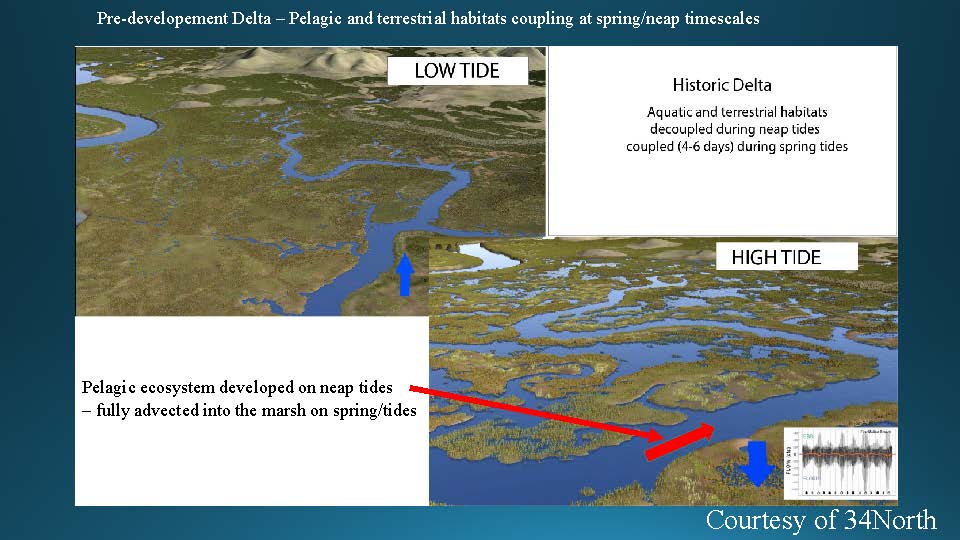 In the historic Delta, aquatic and terrestrial habitats decoupled during neap tides, and coupled for four to six days during spring tides, so the pelagic ecosystem developed on the neap tides and fully advected into the marsh on spring tides. But in this case, the pelagic environment that was created here during the neap tides is completely blown into the marsh because these tides are so extreme. “So even though this looks like a great place, because there isn’t a bunch of marshes next to it that are sucking up the tides, it may not be functionally and probably isn’t going to be functionally the same as what we’ve got when we had the historical marsh.”