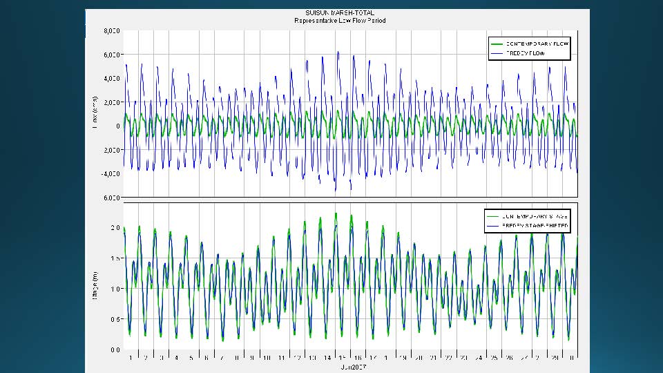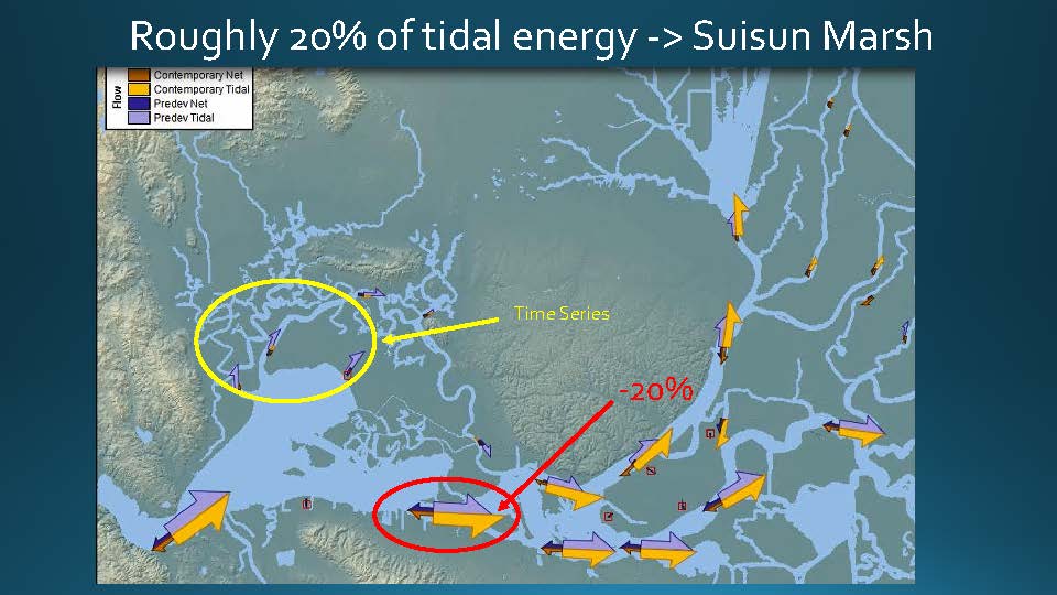 “So when we talk about the integrated effect on the entire system of the loss of tidal marsh, there is a big spring neap variability in the amount of inundation in the system, which means a redistribution of tidal energy,” he continued. “In the predevelopment system, this redistribution occurs at the spring neap time scale because the tides are lazy. On the big tides, it goes more into Suisun Marsh, because it’s right there and the overtopping of those little levees is the easiest place for it to go, so it goes there.”
