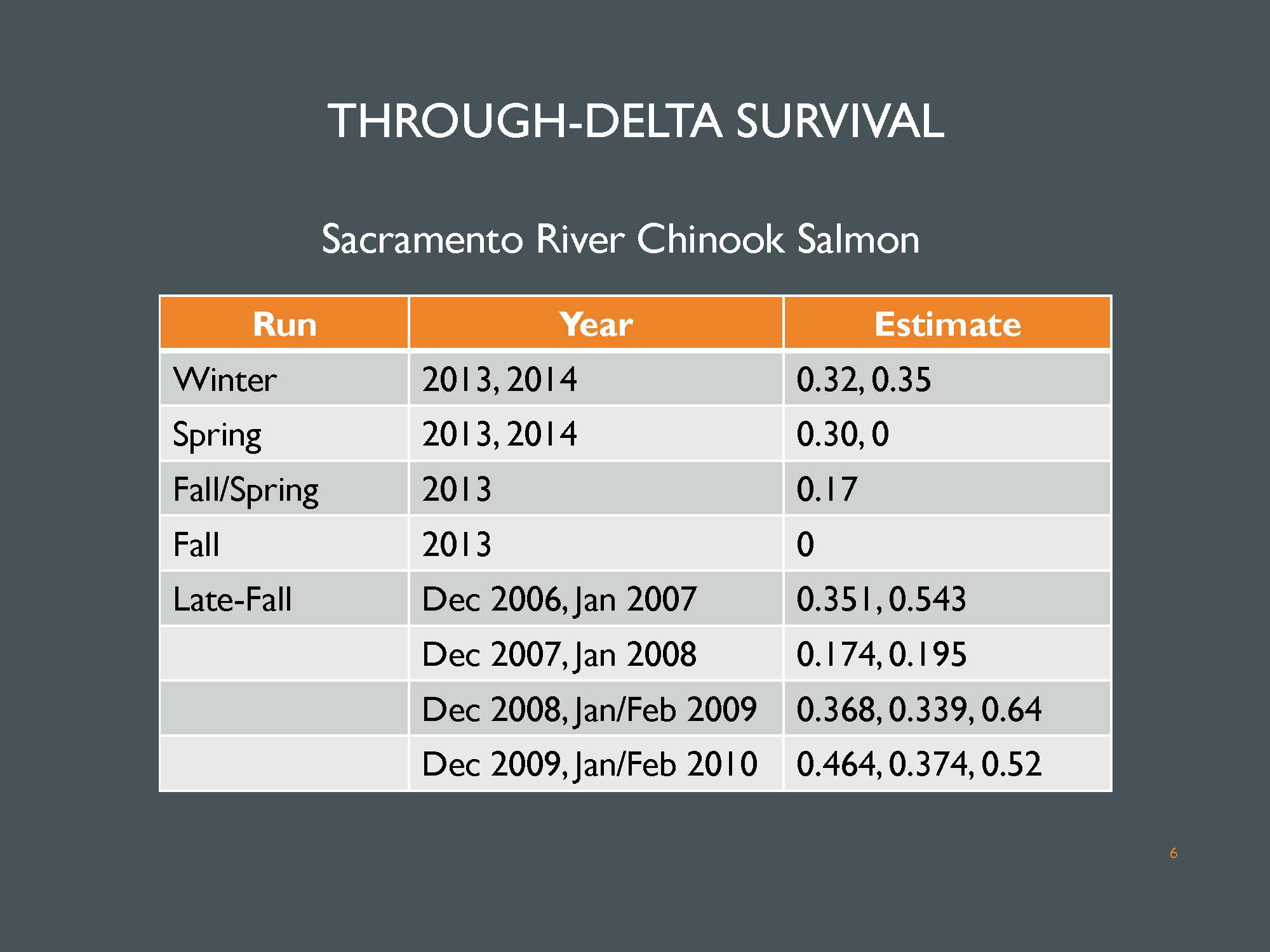 For Sacramento River chinook, there are fewer estimates overall; and taken across all of the runs, they are more variable. “We have some estimates of 0 for fall and spring run chinook, up to about 35% for winter run and then from about 17% to 64% for late fall run, so more variable over all the runs of chinook in the Sacramento, but we have fewer estimates, especially for any one particular run,” she said.