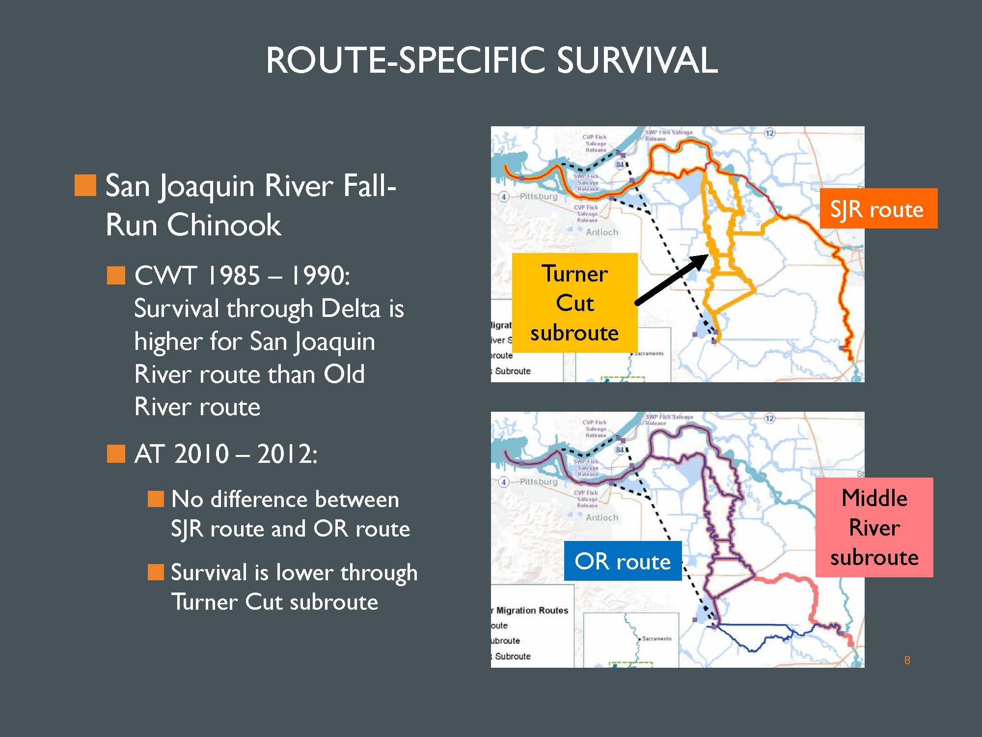 “So what we’re seeing here is that we have particularly poor survival in the interior Delta route, the Turner Cut route, and also in the lower reaches of the Delta,” she said. “There is higher survival in the upper reaches. There is some variability from year to year, but we still have this general pattern of poor survival in the downstream reaches.”