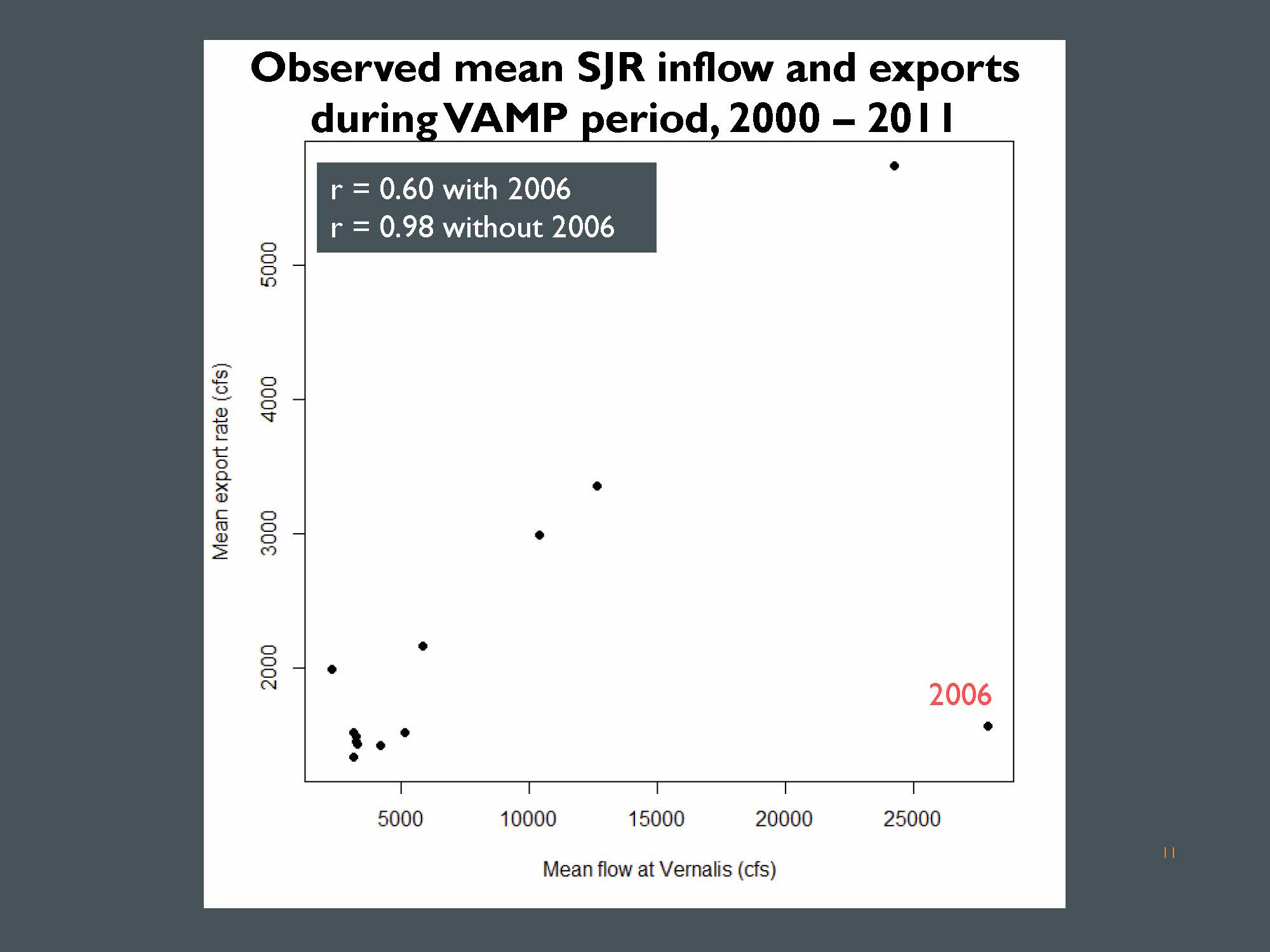 Dr. Buchanan began by showing a plot of the mean San Joaquin River flow at Vernalis on the horizontal axis and mean exports from the VAMP period of each year of the VAMP study, which was from 2000-2011. “That is one month in the spring typically from April 15 to March 15, and what’s obvious here is that for the most part, there’s a pretty tight relationship between exports and inflow, except for this one observation from 2006, where we had high inflow and low exports,” she said. “The overall high correlation here means it’s going to be difficult to distinguish between an effect of inflow and an effect of exports using statistical methods. So bear that in mind, as we look at the results.”