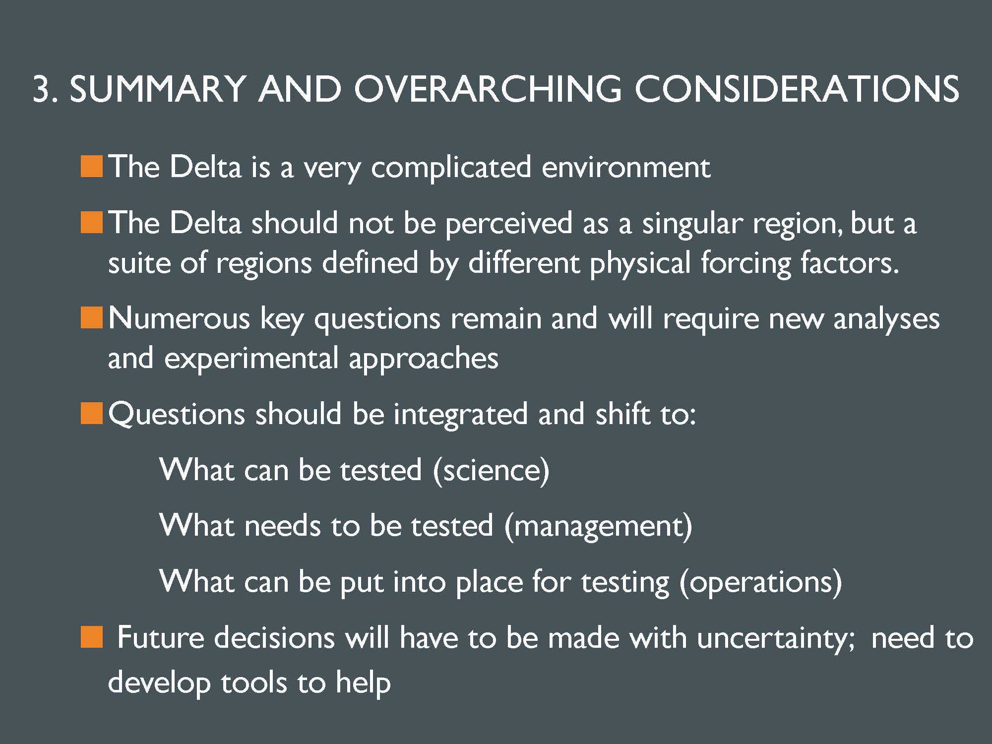 Another one of the overarching considerations is that the questions need to be integrated more with science, management and operations. “The approach shouldn’t be just about researchers coming up with an idea of how we think we ought to do the monitoring; we need to have this integration between the scientists, the managers, and the operators all in the room with the hydrodynamicists, the statisticians, and define what needs to be tested, what are the operations that are really of concern to managers and to the operators, what are the questions that the managers have, and how can the scientists inform how we set up those tests and make those observations.”