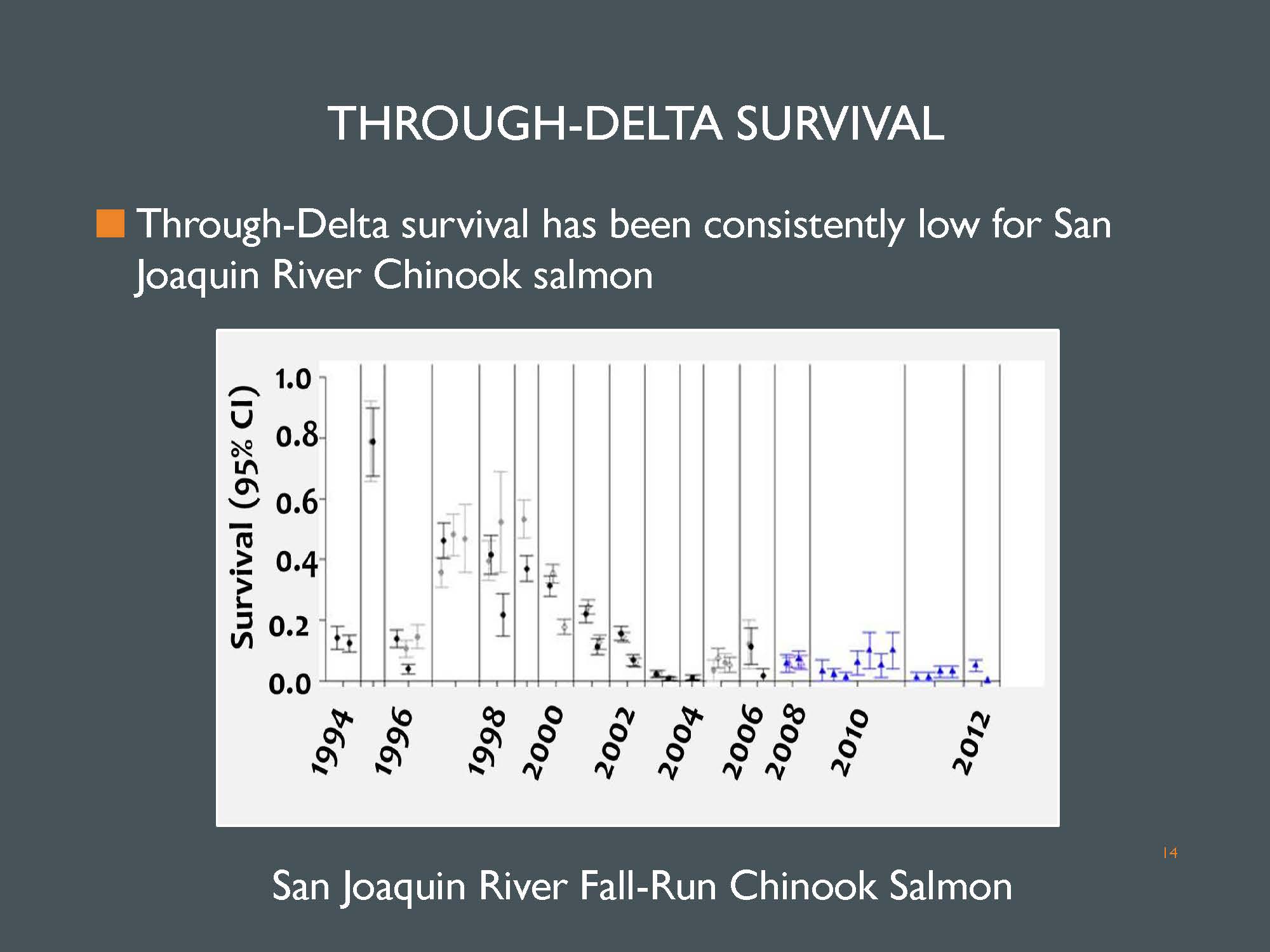 Dr. Buchanan began with survival data, presenting a chart showing through-Delta survival for San Joaquin River salmon. Most of the data comes from San Joaquin River fall-run Chinook; the data was wire-tagged data up through 2006, and then acoustic telemetry since then. “Plotting them all on the same plot here, we see that survival has declined quite a bit from the late 1990s, and it’s been particularly low since 2002, with limited variability in that last decade,” she said.