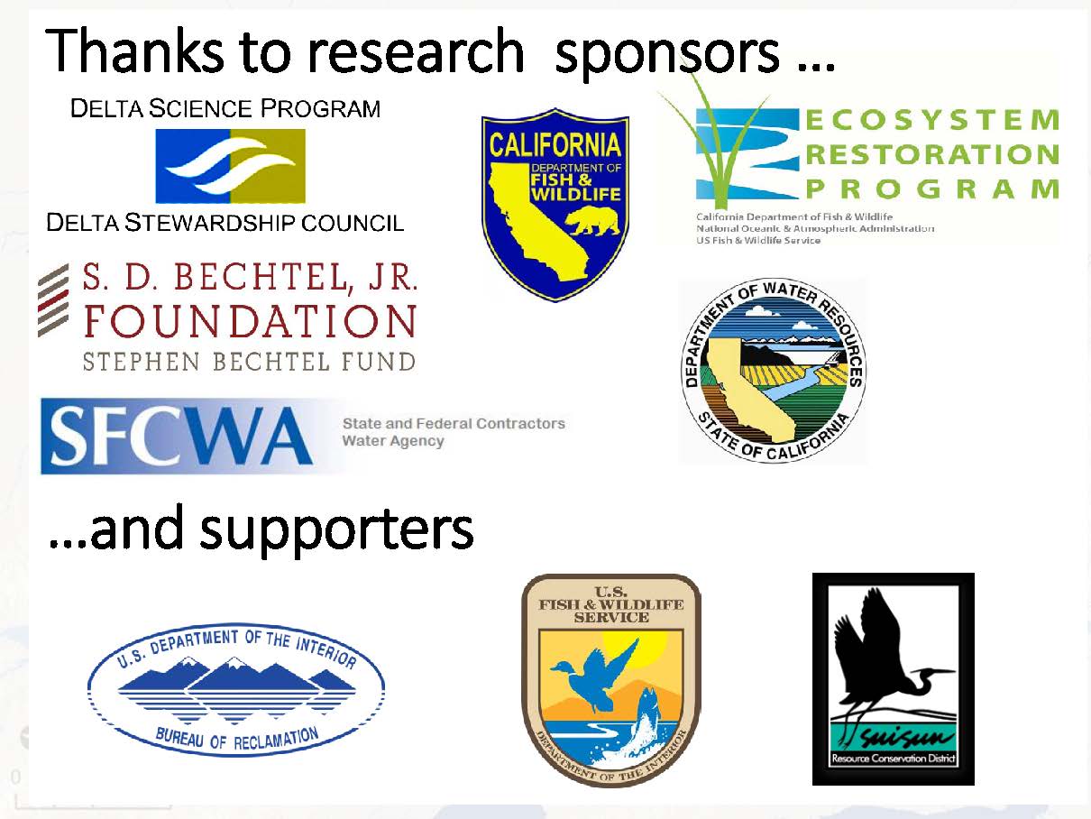 Dr. John Durand began by noting that his and Dr. Peter Moyle’s research group has been examining regions of the Delta, including Suisun Marsh. A lot of the work that they do overlaps with planned, preexisting, or nonexistent restoration sites. The work spans a giant swath of habitat in the northern estuary that they refer to as the “Northern Arc of Native Fishes.’