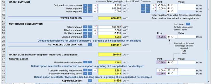He presented an example of a portion of the spreadsheet, noting that you enter the water supplied, the authorized consumption, and the spreadsheet will calculate the water losses. The spreadsheet can accommodate different units of measure such as acre-feet or millions of gallons per day.