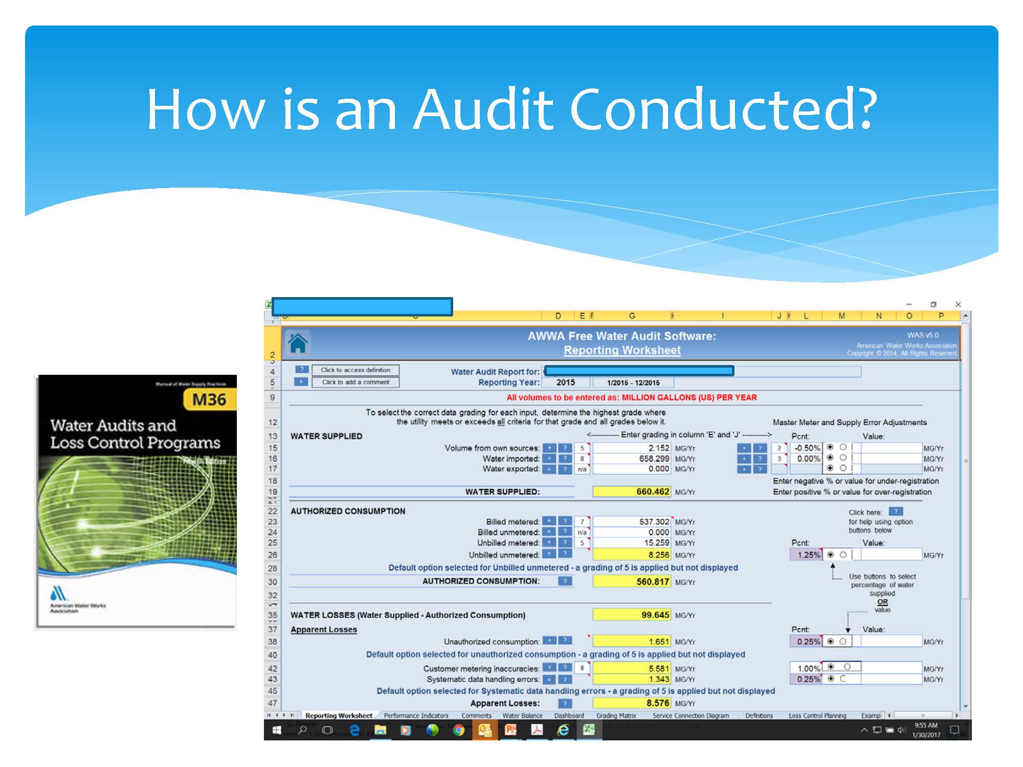 The audit will give a score for data validity; a score of “1” is very low; less than 25% of the sources are metered, the rest of them are estimated; there’s really no calibration going on. At the opposite end, an “8” means all sources are metered, calibration is done annually, and less than 10% of the meters that they use in their supply systems are plus or minus 5%, which is a fairly tight management system.