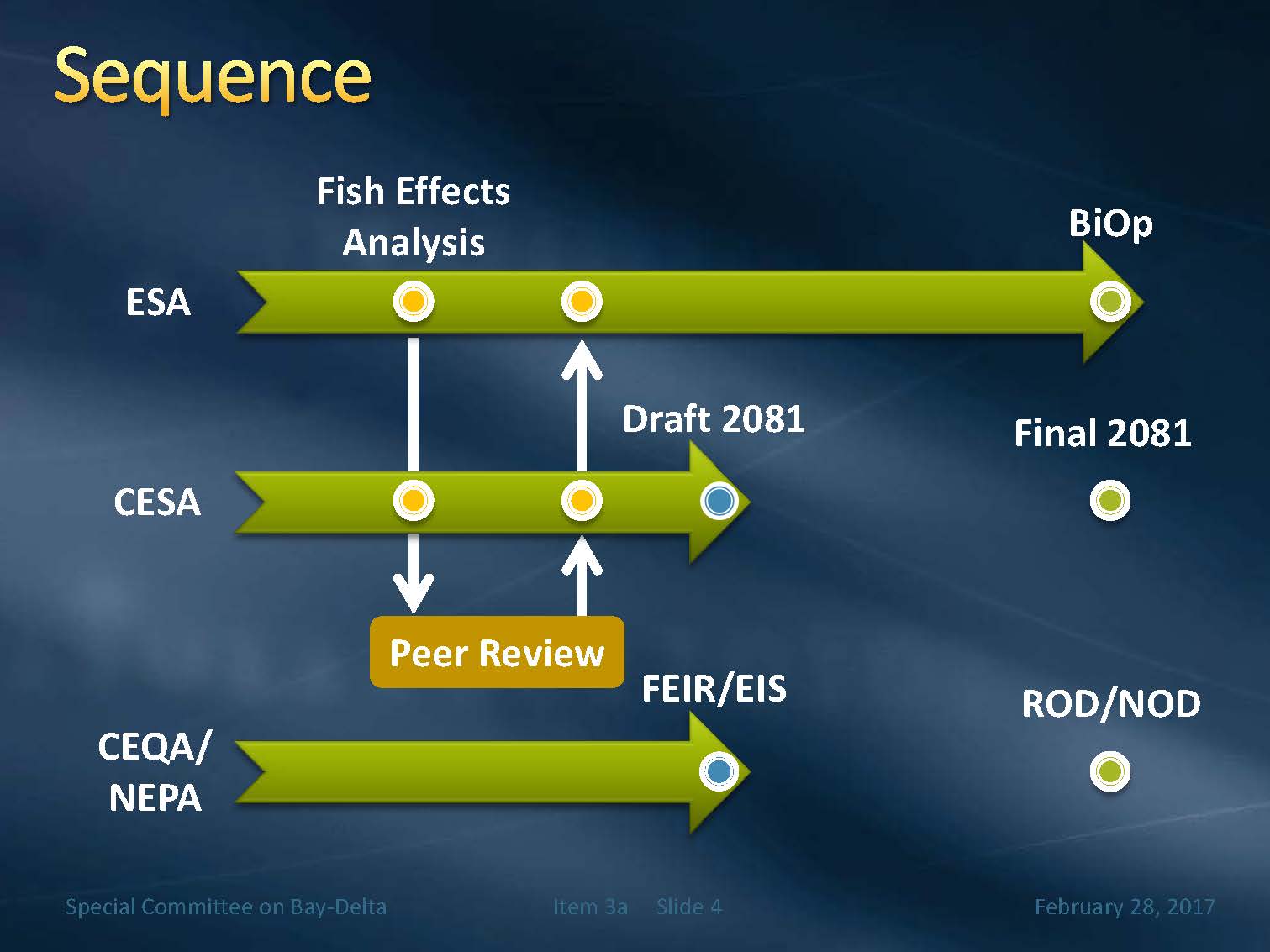 Mr. Arakawa presented a graph showing how the timing and sequencing of the procedures lays out. The Delta Science Program of the Delta Stewardship Council is conducting an independent peer review on portions of the biological opinions, the state and federal. Then once the peer review is completed, the agencies would then finalize the 2081 document and the biological opinion documents and then they would consider a decision, and that would lead to a decision on the environmental reports, the ROD, and the NOD.