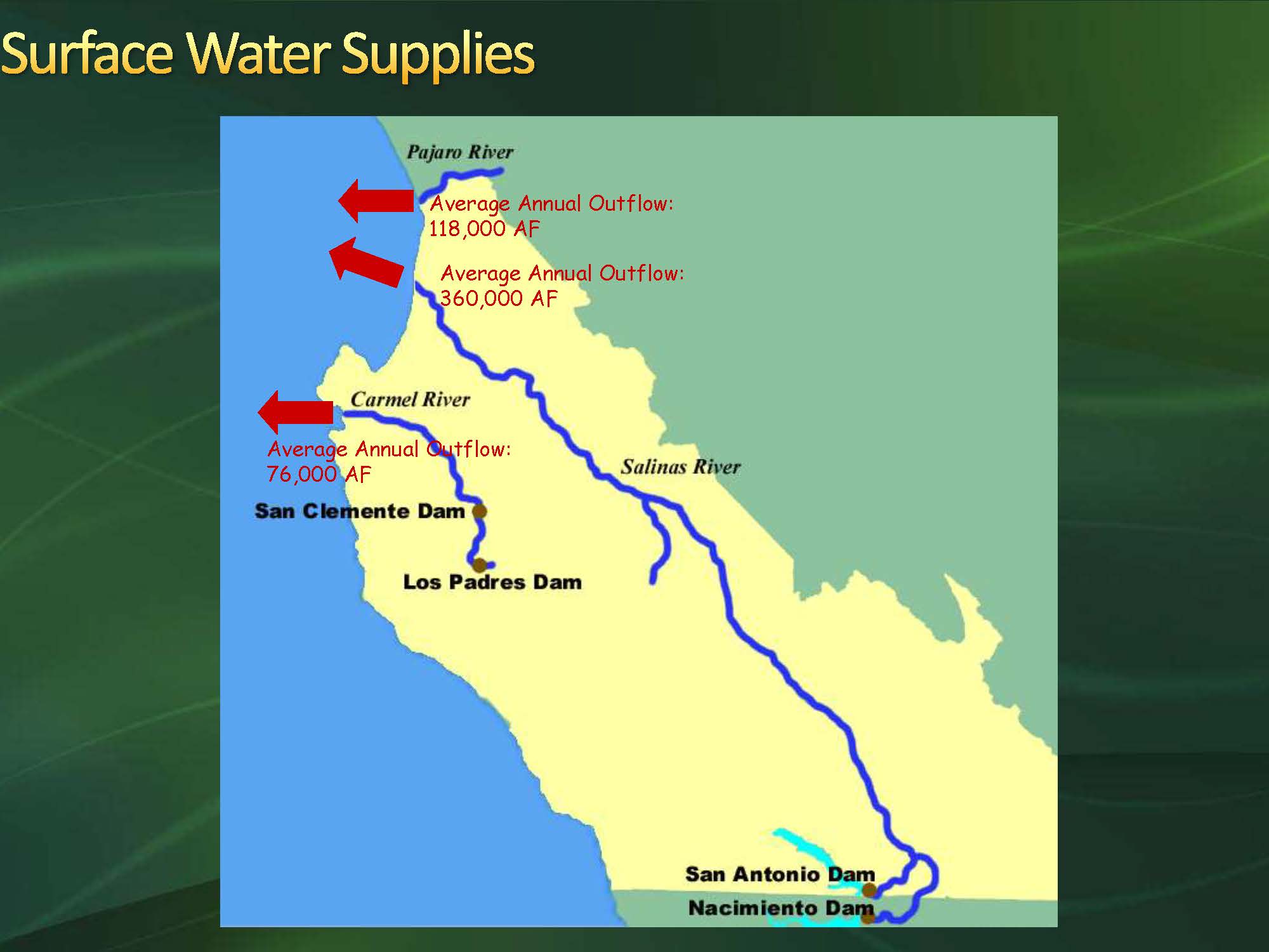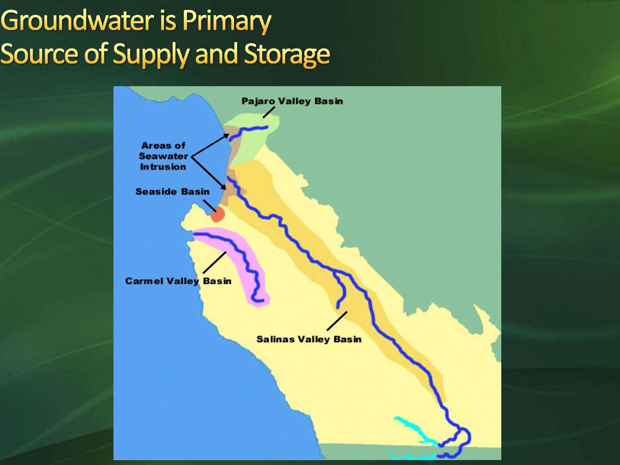 Groundwater is the primary source of supply and storage. The groundwater basins are the Pajaro Basin, the Salinas Valley Basin, the Carmel Basin, and the Seaside Basin.