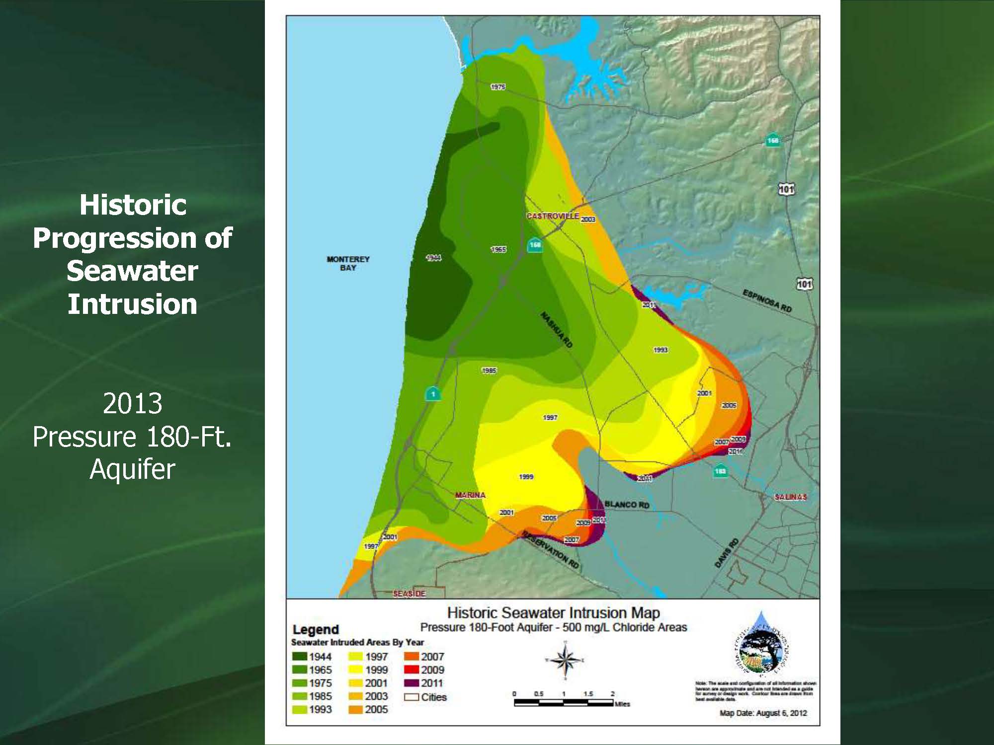 He next presented a graph of sea water intrusion that has been occurring in Monterey County since 1933, and has been moving forward. “This should look familiar to anyone who has seen a DWR webinar or presentation because we were the poster child for what they use for an undesirable outcome,” he said. “The 180-foot aquifer was used first and then as that one became salty, they just drilled deeper to the 400-foot aquifer. There’s actually another aquifer underneath that we have yet to see sea water intrusion in.”