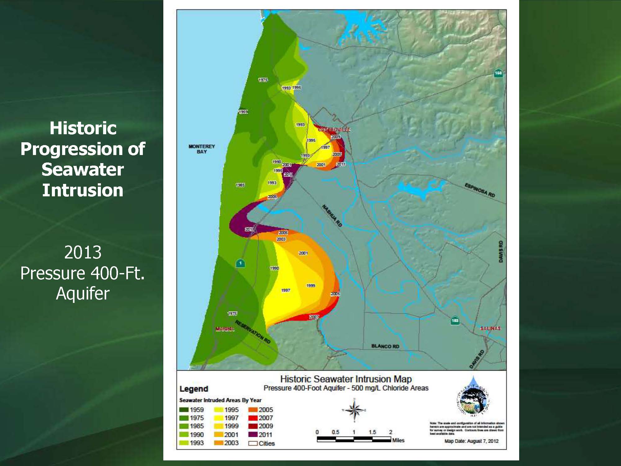 Nitrates are a problem, a result in part of legacy agricultural operations, as well as a large number of septic tanks. The area has now been sewered so they are hoping to see nitrate values decrease over time. Then there is the drought and declining water levels. “Right now, you would expect seawater elevations to be about zero, close to the coast maybe or somewhere thereabouts. Eight miles inland right now is where sea level is in the aquifers. We’ve got definitely a very large hole that we’ve created for ourselves there and we’re going to figure out a way to get out of it.”