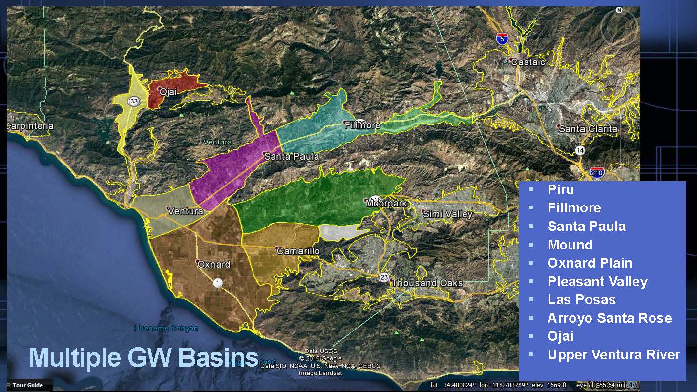 There are several groundwater basins in Ventura County. The Santa Paula basin and the Ojai basin are adjudicated; then there is Piru, Fillmore, Mound, Oxnard Plain, Pleasant Valley, Las Posas, Arroyo Santa Rose, and the Upper Ventura River. “We have lots of overlying water agencies,” he said. “We couldn’t do this if there wasn’t complications in overlap and things like that. This is water, it can’t be simple. It has to be complicated.”