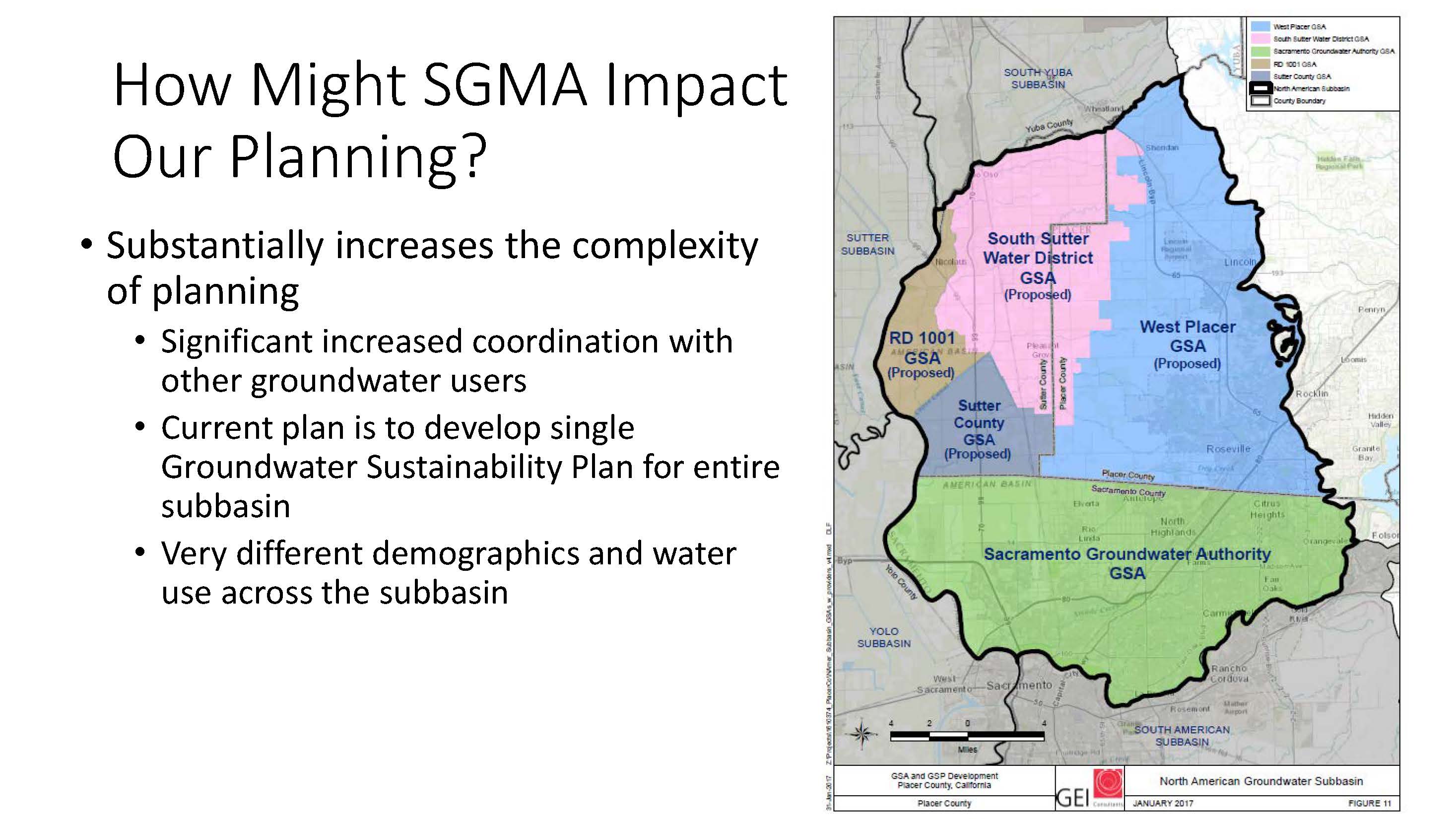 They are forming five groundwater sustainability agencies; the Sacramento Ground Water Authority declared its intent to be a GSA in October of 2015 and others are wrapping up their planning now.