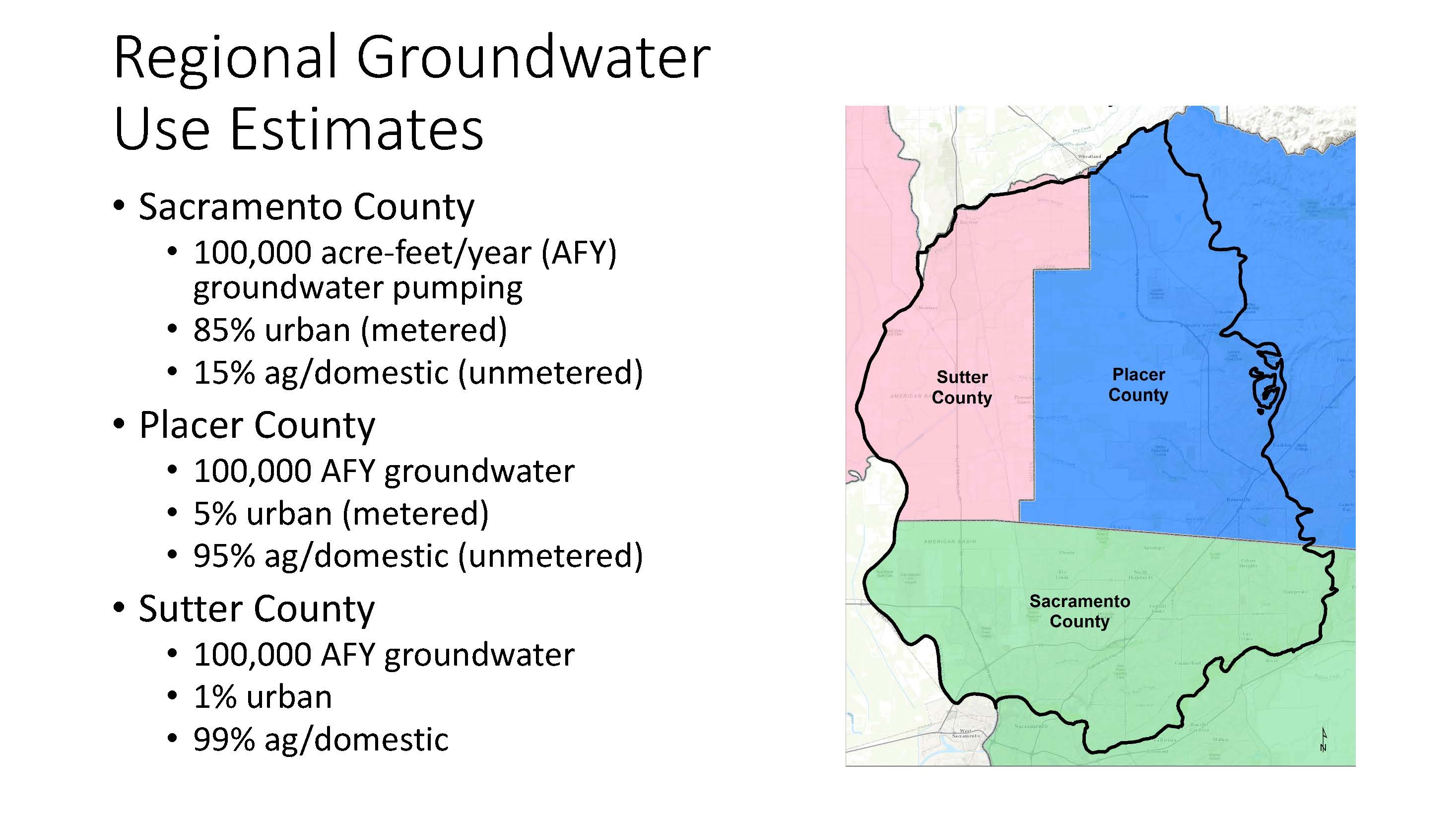 In Placer County and Sutter County, that is flipped completely around. “North of the Sacramento County line, it is predominantly agricultural pumping – 90% or more. So that’s going to be a challenge going forward as a lot of ag areas are figuring out how are we going to pay for things. Is it going to be charged based on land area? based on pumping? It’s such a more diverse group of pumpers that outreach and the involvement is significantly increased.”