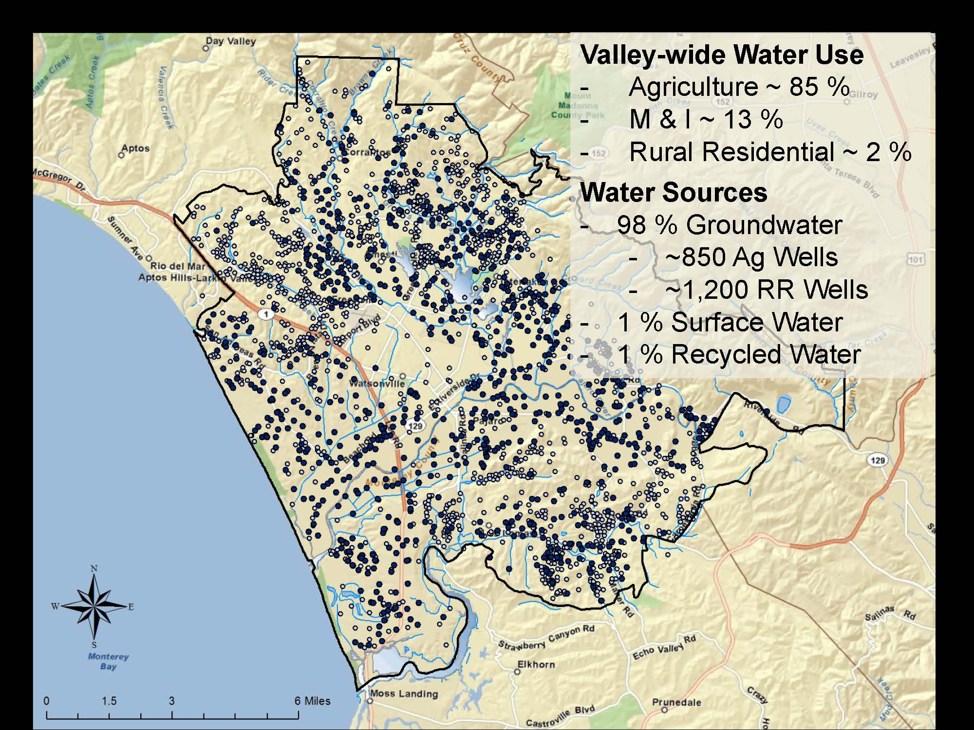 Virtually all water use comes from groundwater; 1% comes from surface water and another 1% from recycled water. There are about 2,000 wells within the agency’s service area.