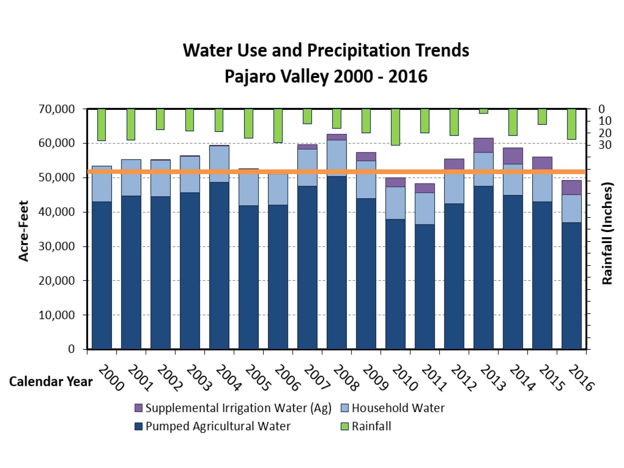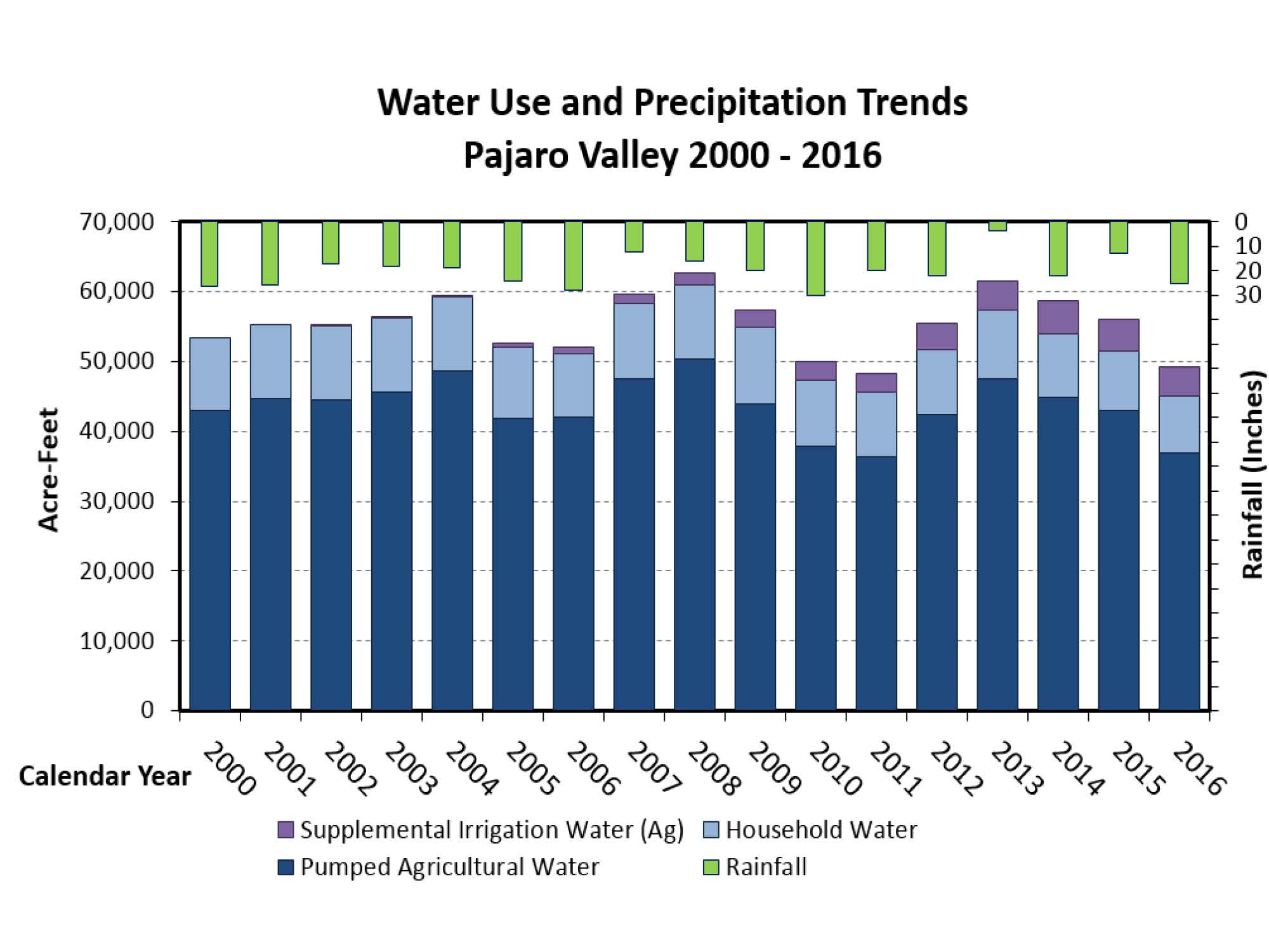 All of the wells are metered except for domestic wells. On the bar graph, dark blue shows metered production for agriculture; light blue is the household water use; the purple bar at the top is the supplemental water supply facility; the green bar is rainfall.