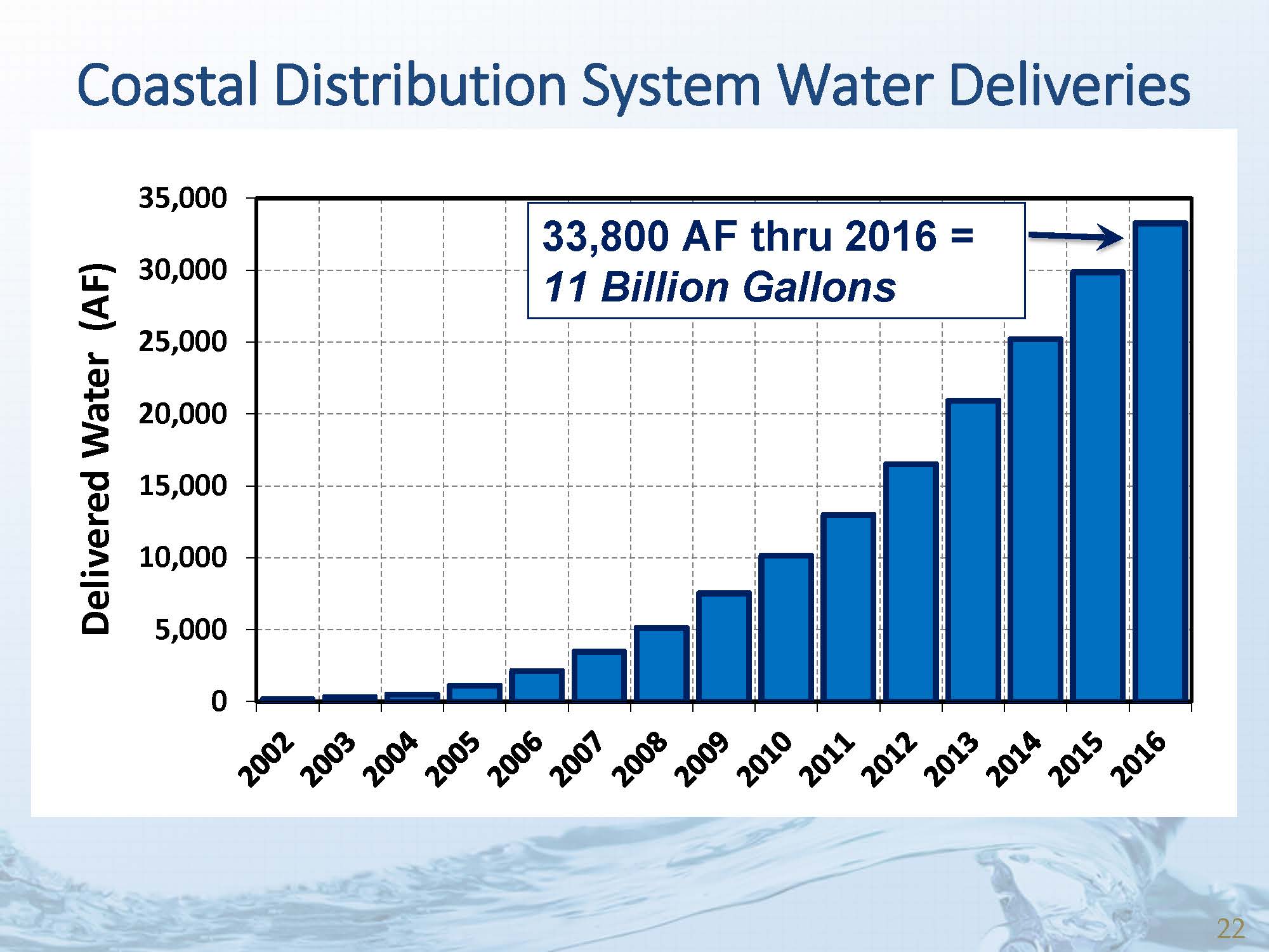 He next presented a map of seawater intrusion, noting that the map illustrates a chloride concentration of 100 parts per million which shows the inland migration through time which has drastically slowed since the water supply facilities began delivering water.