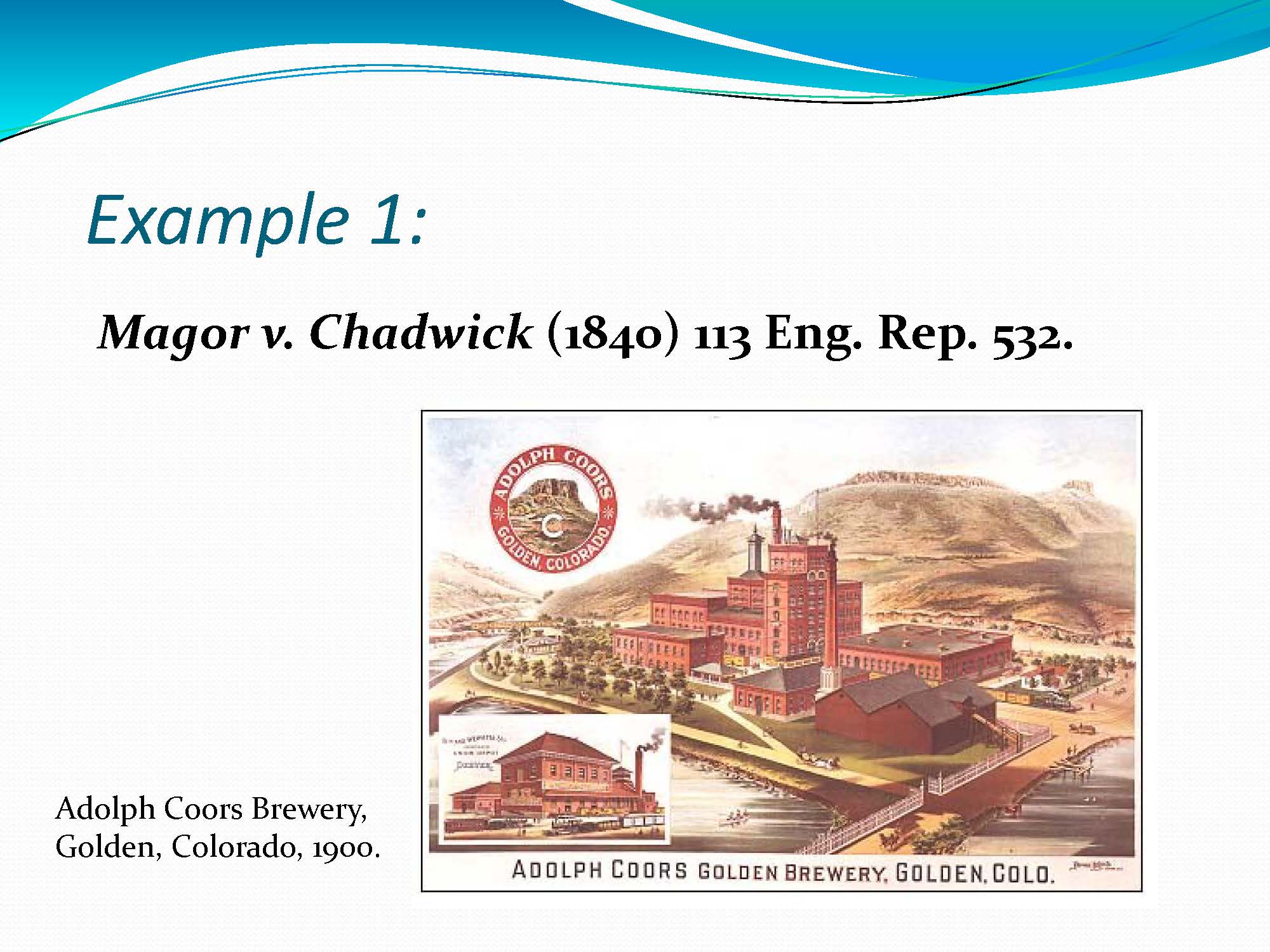 Example 1: A brewery constructs its facility on the banks of a channel that provides a water supply of adequate quantity and quality for brewing beer. A copper mine commences its operations upstream, and its use of the water pollutes the water to a degree that is no longer fit for brewing. “Our brewer has a cause of action against the copper mine,” Ms. Kuenzi said. “It’s an English case from 1840, and although English, the fact pattern repeats itself. We have breweries; here we have the Coors Brewery. This is circa 1900, the Coors Brewery in Golden, Colorado, right on the banks of Clear Creek.”