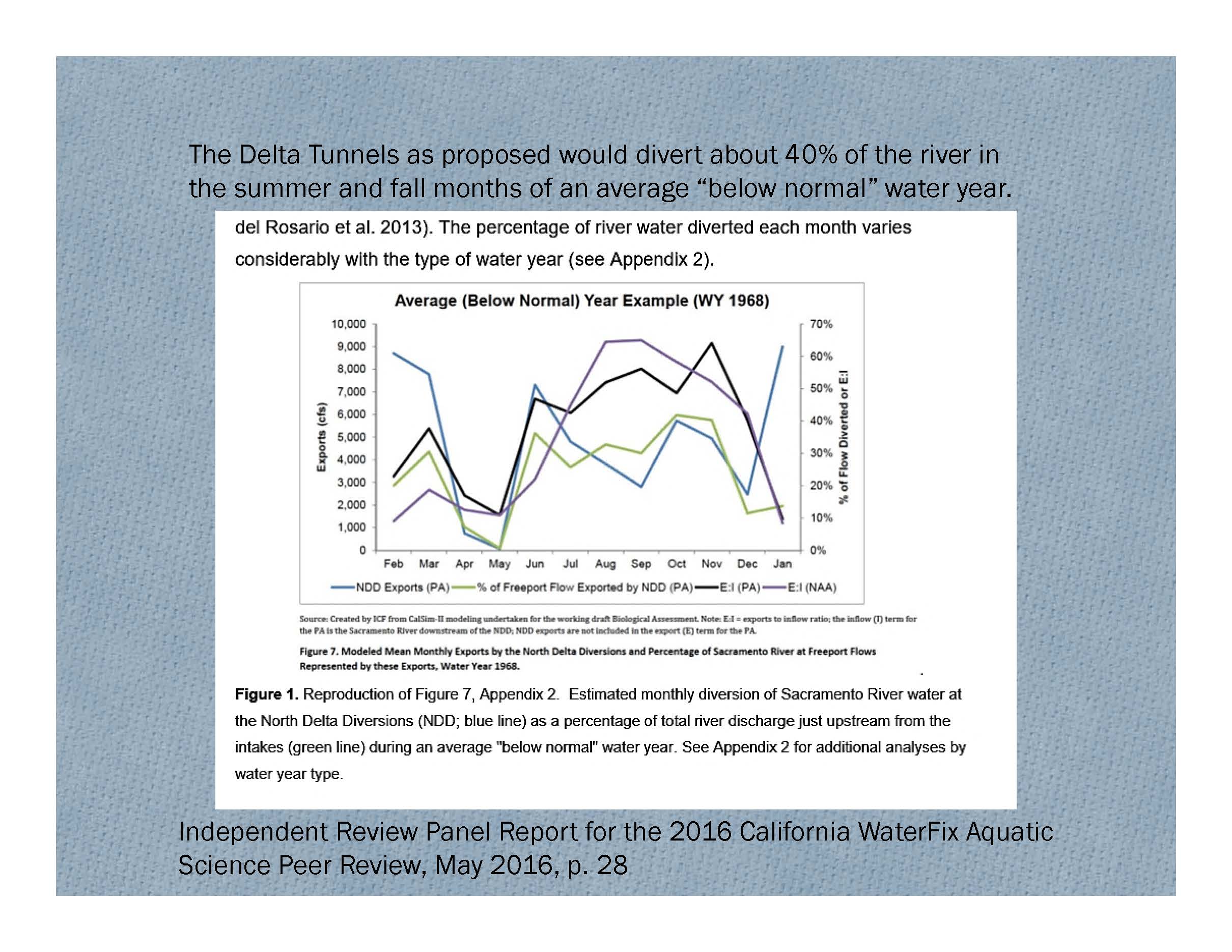 She presented a graph from the science peer review of the biological assessment. “The point of this is just to show that in a below normal water year, about 40% of the river would be diverted in the summer and the fall when conditions are most stressed,” she said. “So this idea of big sip, little gulp sounds quite good, but if any diversion project was to do that, it would need to be within the operational plan required for that project, and the type of flexibility being requested currently for this project in addition to the type of flexibility that is still allowable under the recommendations in the Delta Plan amendments wouldn’t prevent this type of operation.”