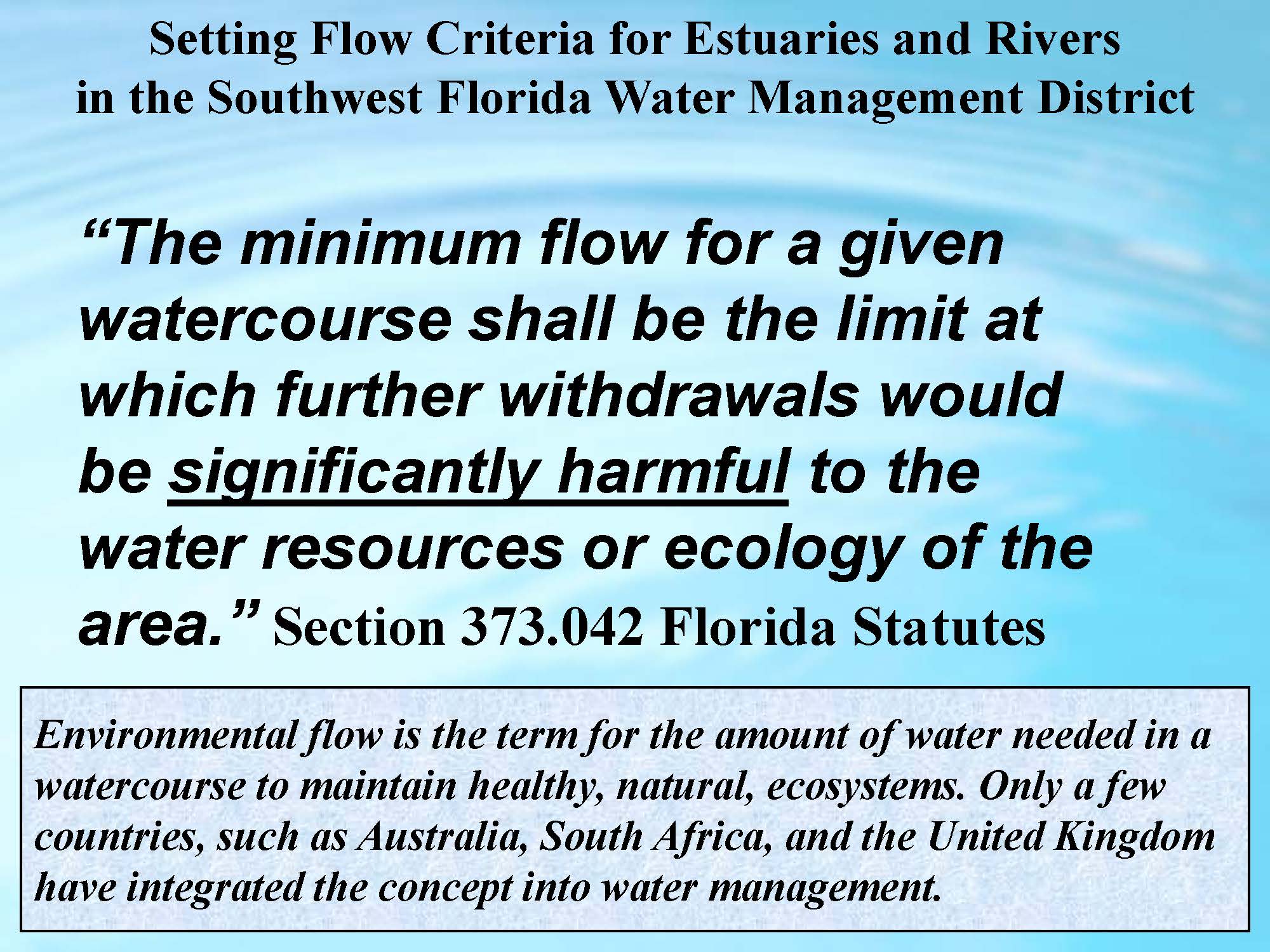 Florida passed a law back in the early 1970s that required a minimum flow to be established for all major rivers, springs, and estuaries in Florida. The statute says: ‘The minimum flow for a given watercourse shall be the limit at which further withdrawals would be significantly harmful for water resources or ecology of the area.’