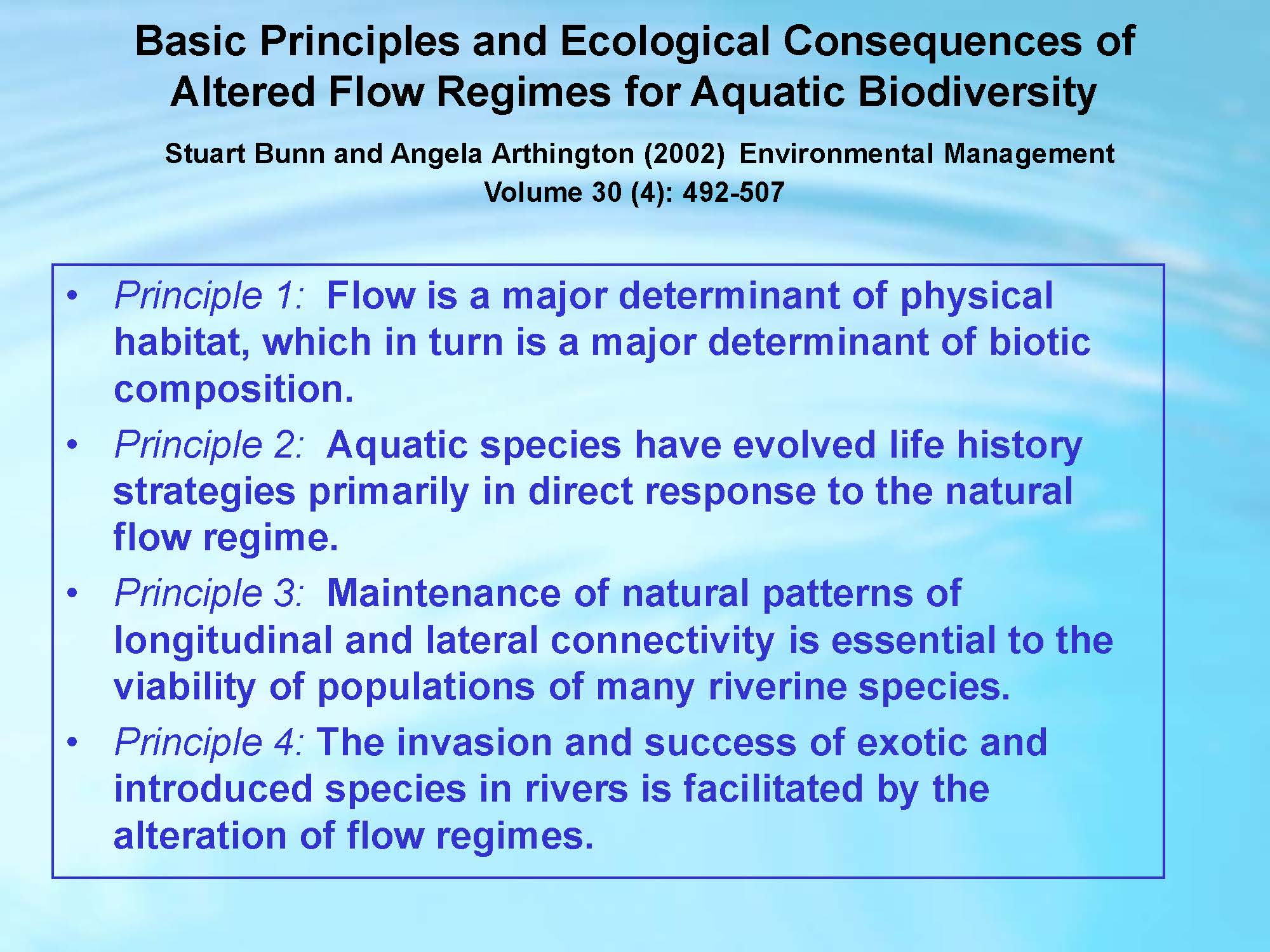 For guidance, they looked to the principles embodied in the 2002 article by Stuart Bunn and Angela Arthington, Basic Principles and Ecological Consequences of Altered Flow Regimes for Aquatic Biodiversity: