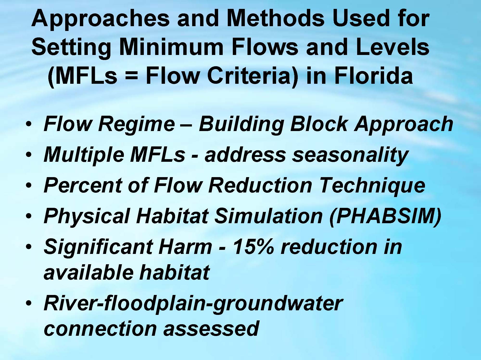The Southwest Florida Management District, located around Tampa Bay, has been the most effective at setting flow criteria. “They have set flow criteria for at least a dozen of the rivers, three of their major springs, and one estuary,” he said. “I will admit readily estuaries are much more difficult.”