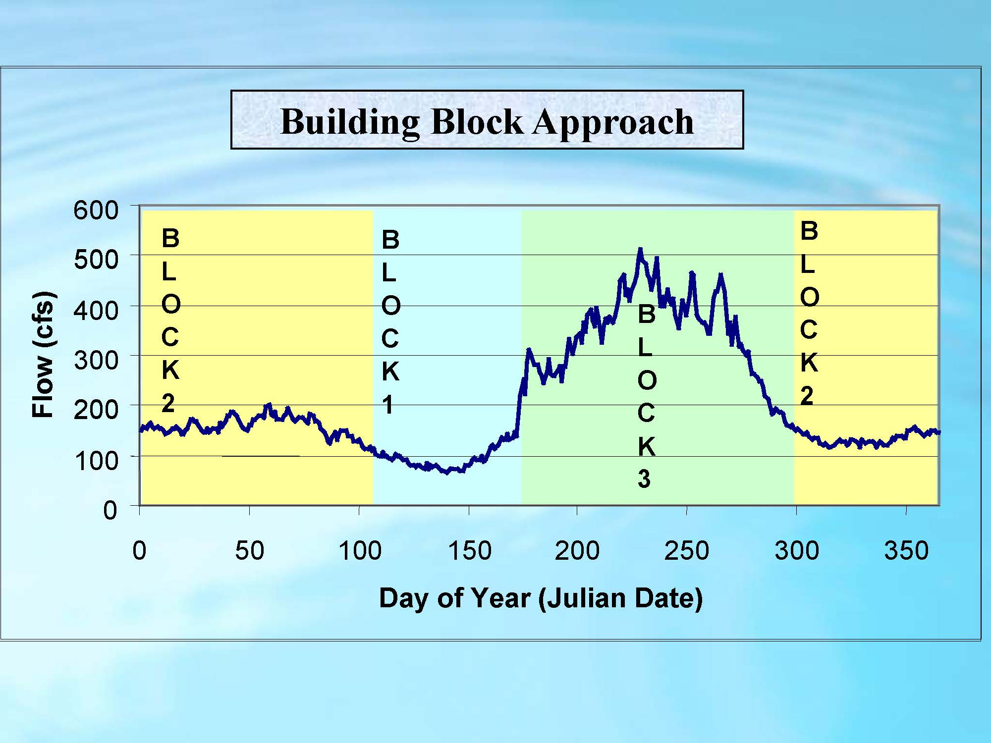 He presented an example of their building block approach, noting that this is a typical central Florida hydrograph that’s been divided into three periods of time, from which they then go through the process of setting the flow criteria. Block 1 is the period of time when the lowest flows are expected to occur within those systems; in this part of Florida, May and June is when the predictably lowest flows are seen. Block 2 is the dry season, which is typically from January through April or May. Block 3 is the wet period, when convective thunderstorms that are prevalent as well as precipitation from dissipating tropical storms that occur in this region.