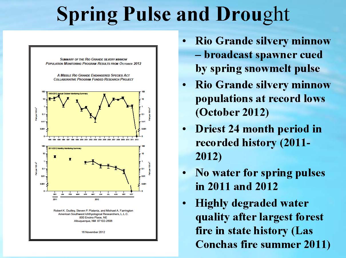 He presented a slide with graphs from a recent report. The upper diagram is about 20 years of data collected at 30 locations on a logarithmic scale for the numbers of Rio Grande silvery minnow that have been collected. “All I want you to see is that there was a two year period, 2002-2003, associated with a substantive drought where populations declined by about 2 orders of magnitude,” he said. “This was of great concern; it was a period of time where there was a lot of discussion about what is going to be the fate of this species. Then the drought broke and there was a period of time when there was enough water in the system to do a pulsed spring release. This fish species is very dependent on this spring flow followed by a gradual and predictable recession. This is a fish species that broadcast spawns, when that cue is in the system. And so in this period of time after this very marked downturn in 2002-2003, there was enough water that they had managed releases, and they did have this kind of spring snowmelt. Populations rebounded pretty significantly. It rebounded almost 1000x what they were pre bottleneck.”