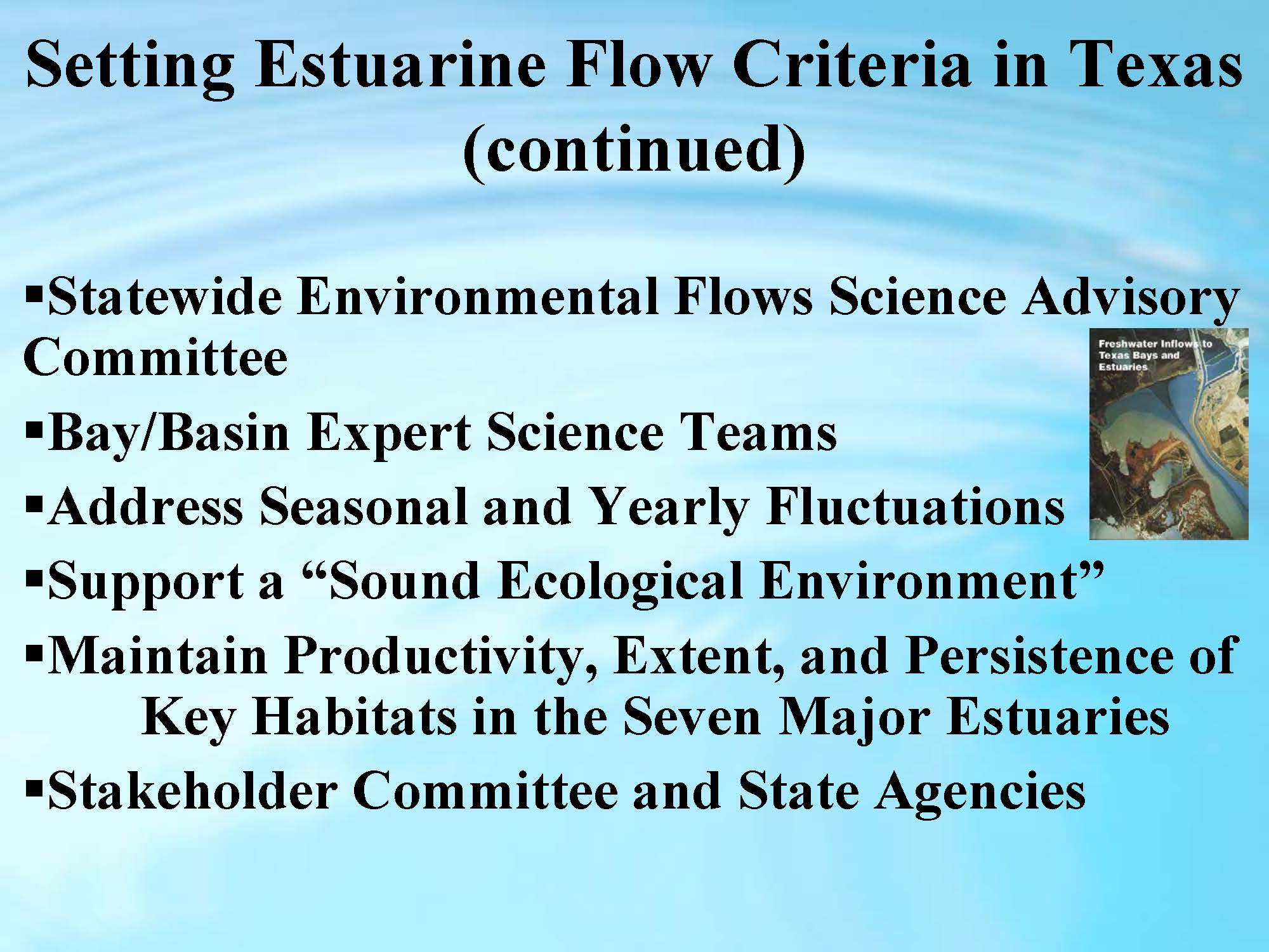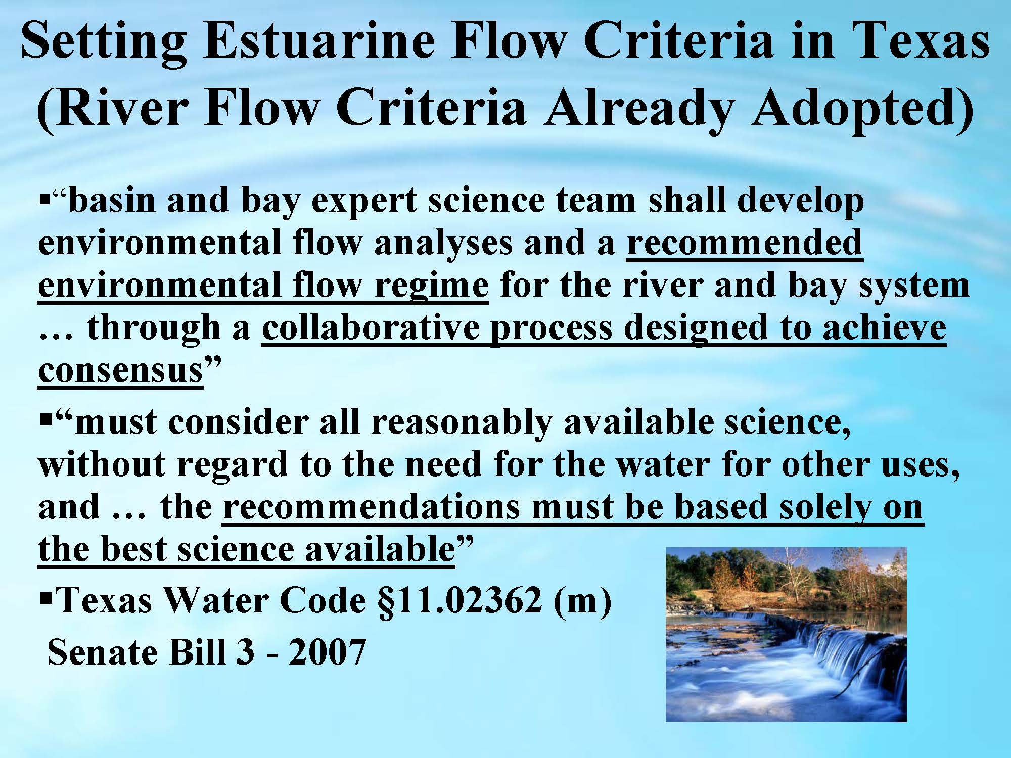 “They have set up a process that they are trying to work their way through,” he said. “They have a statewide environmental flow science advisory committee; this colleague of mine is on that committee, so he has that statewide perspective. They have set up bay-basin expert science teams. They are supposed to address the seasonal variability and the interannual fluctuations, so they are supposed to take both that shorter and longer term perspective. … The law calls them to do the seven major and then five minor and they are already well behind schedule.”