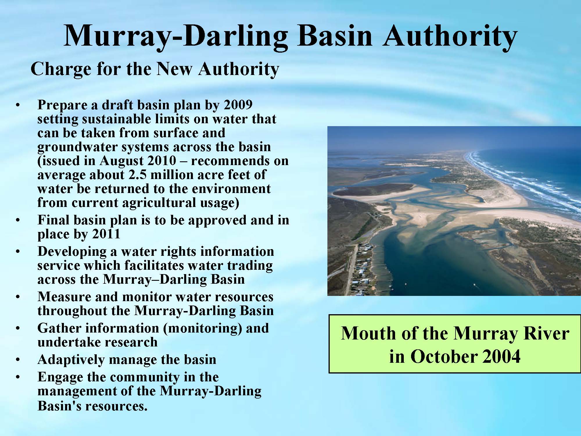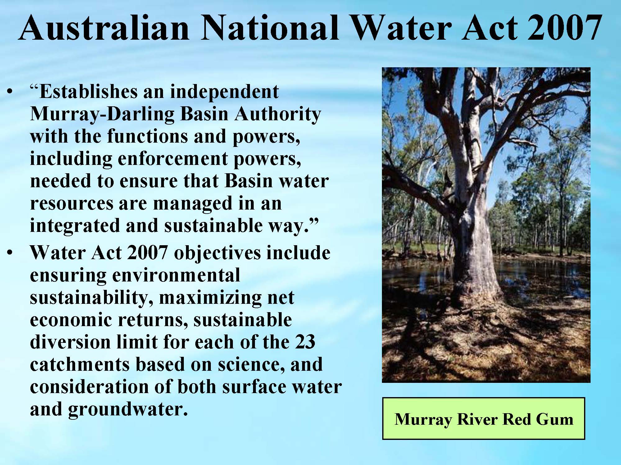 The crisis spurred legislative action, and the Australian National Water Act of 2007 was passed. “An interesting aspect of Australian water laws is when they pass new water law, all the old stuff goes away and then they work from the new stuff,” he said. “They established an independent authority called the Murray Darling Basin Authority and this basically group this has been charged with coming up with a flow criteria and a water management regime for the Murray Darling basin. There’s some interesting requirements in the act. For example, the 23 catchments, all of them have now been modeled with coupled groundwater-surface water hydrologic models, and it’s required that they really address this issue of the connectivity between surface water and groundwater as they make some of the planning decisions that they are going forward with.”