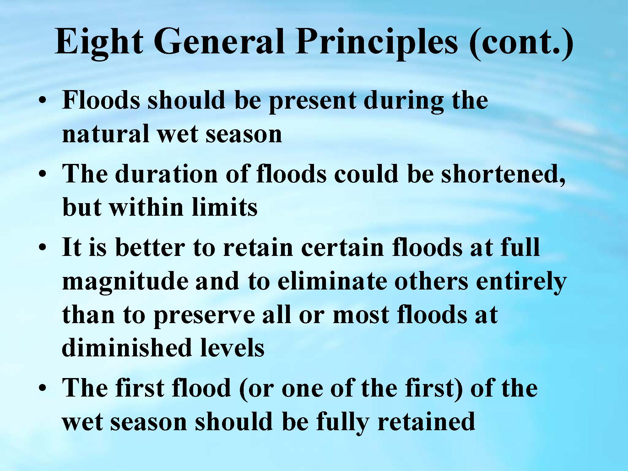 “Another is that floods should be present during the natural wet season,” he continued. “The duration of floods could be shortened, but within limits. So one way to extract water they suggest is to actually shorten the duration of some of their higher flow events as one mechanism of getting water for human use. The next thing that they suggest is that it’s better to retain certain floods at full magnitude during the wet season and eliminate others entirely than to preserve all or most floods at diminished levels. Don’t mow the hydrograph down; leave some of that natural variability that shape channels and if you need to, take away some of the floods but leave some of that geomorphic functionality in place. And the last principle was the first flood, or one of the first floods of the wet season should be fully retained.”