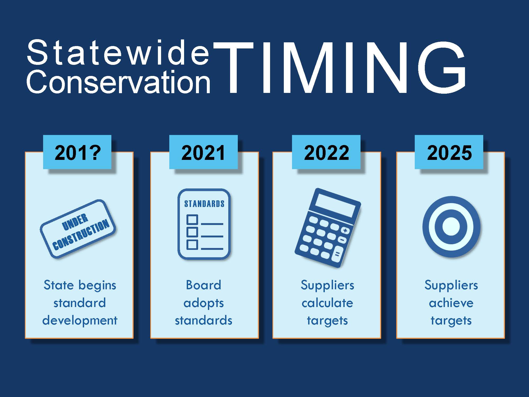 The state would begin standard development after passage of the legislation. The Board would adopt standards around 2021. Suppliers would begin to calculate their targets in 2022 and begin reporting to the Department in 2022. Suppliers would be required to meet their targets by 2026.