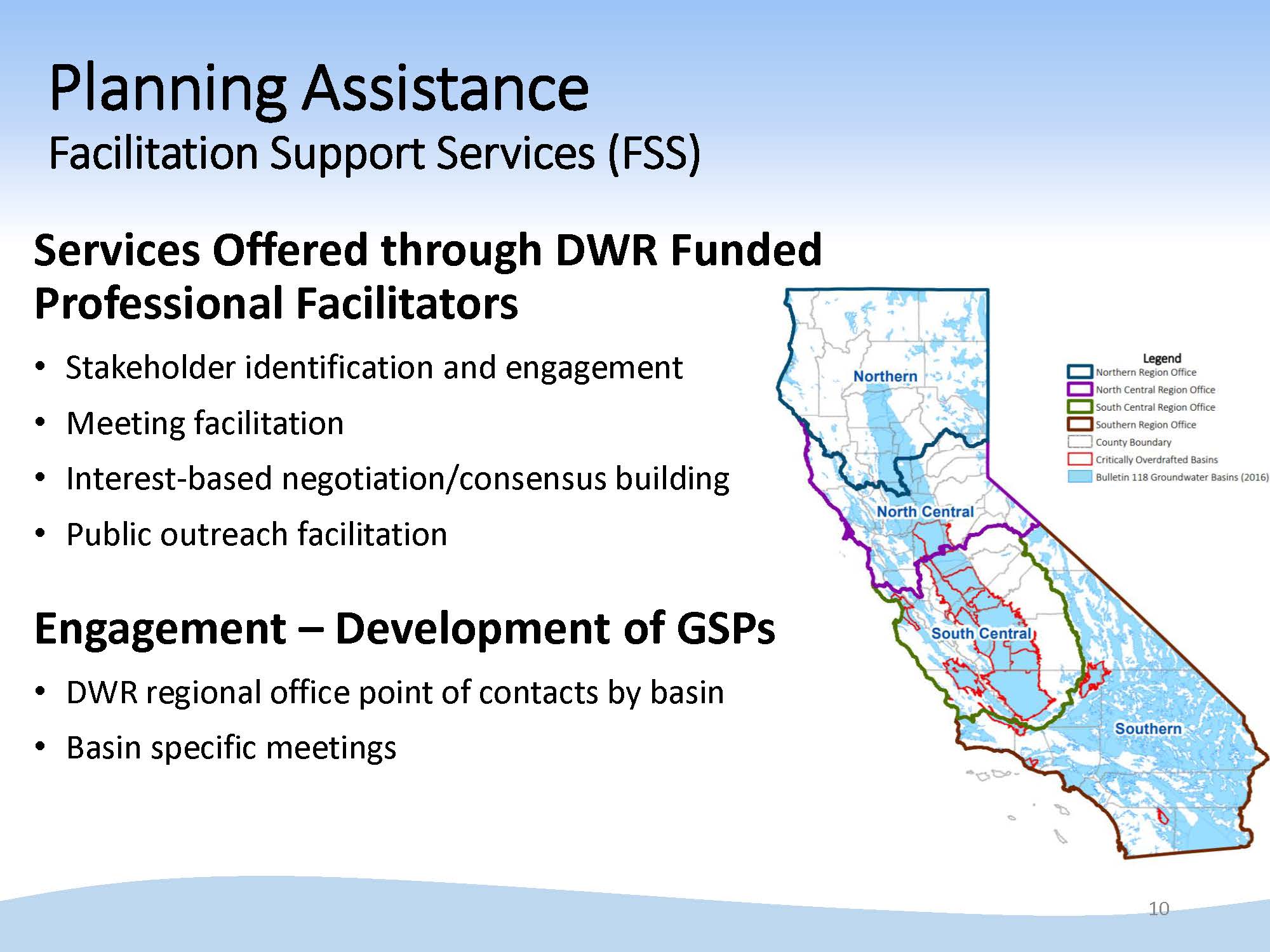 Financial assistance: The Department received $100 million to award to local agencies as part of Prop 1 for groundwater management. They did an early round of funding with a limited amount for counties, but the vast majority ($86.3 million) remains for use towards completing groundwater sustainability plans. At least $10 million of the $100 million must be used for severely disadvantaged communities.