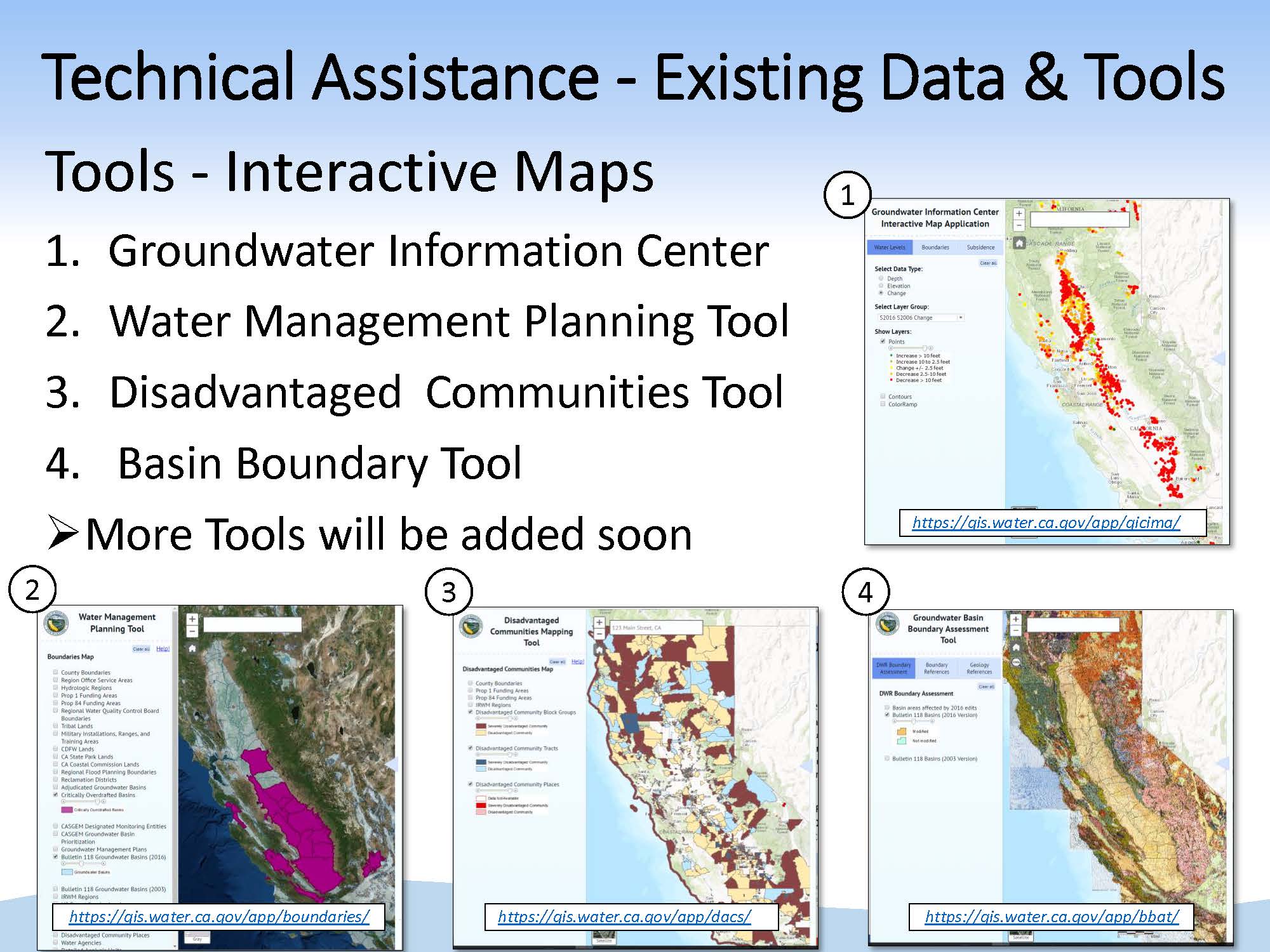 Other technical tools include the Groundwater Information Center which currently has groundwater level and subsidence data; the water management tool which focuses on boundaries such as existing IRWM boundaries, water agency boundaries, county boundaries, and existing groundwater management plans; a tool for disadvantaged communities to find grant dollars, and the basin boundary tool which provides geologic information for local agencies. More tools are planned in the future to aid in SGMA implementation, he said.