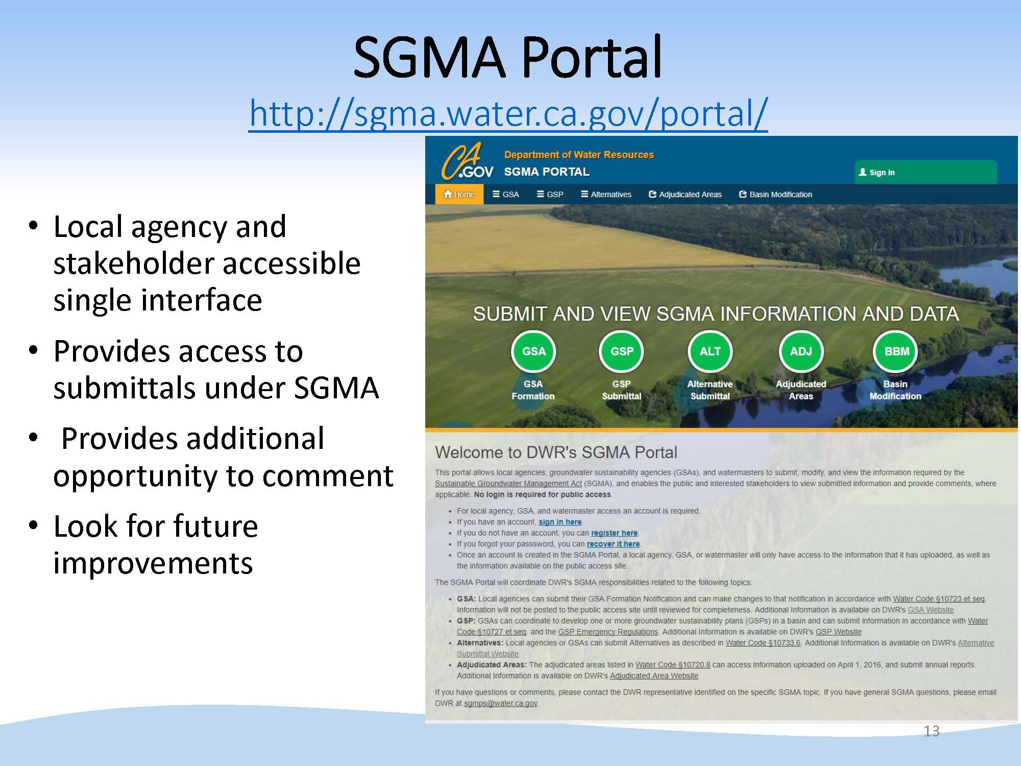 The SGMA portal is a one-stop shop to locate GSAs and the documents that have been submitted to the Department related to SGMA obligations. Alternatives can be found here as well. The GSP submittal tool and documents will be here when they are due to be submitted.