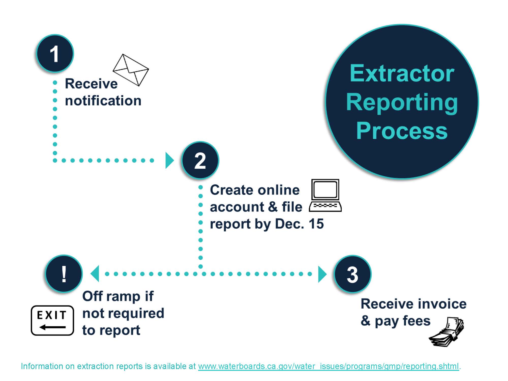 The extractors will have to provide information such as their well location, the capacity of their well, the volumes of water pumped, and how they are using the water, and where that water is being used. These reports have to be filed annually electronically; there is a map-based interface that is part of the form that collects the information for where the well is located and then identifies where the water was used.