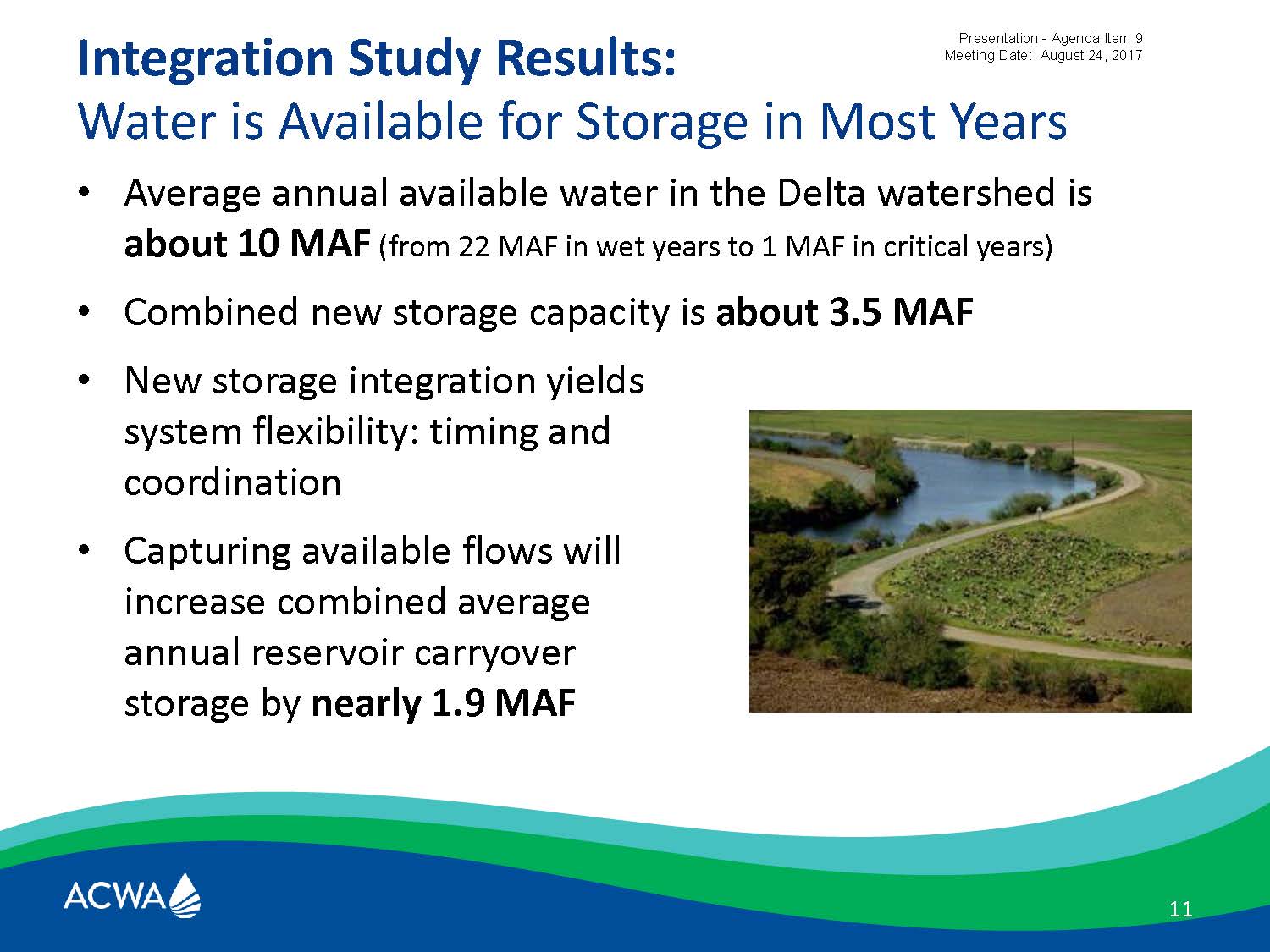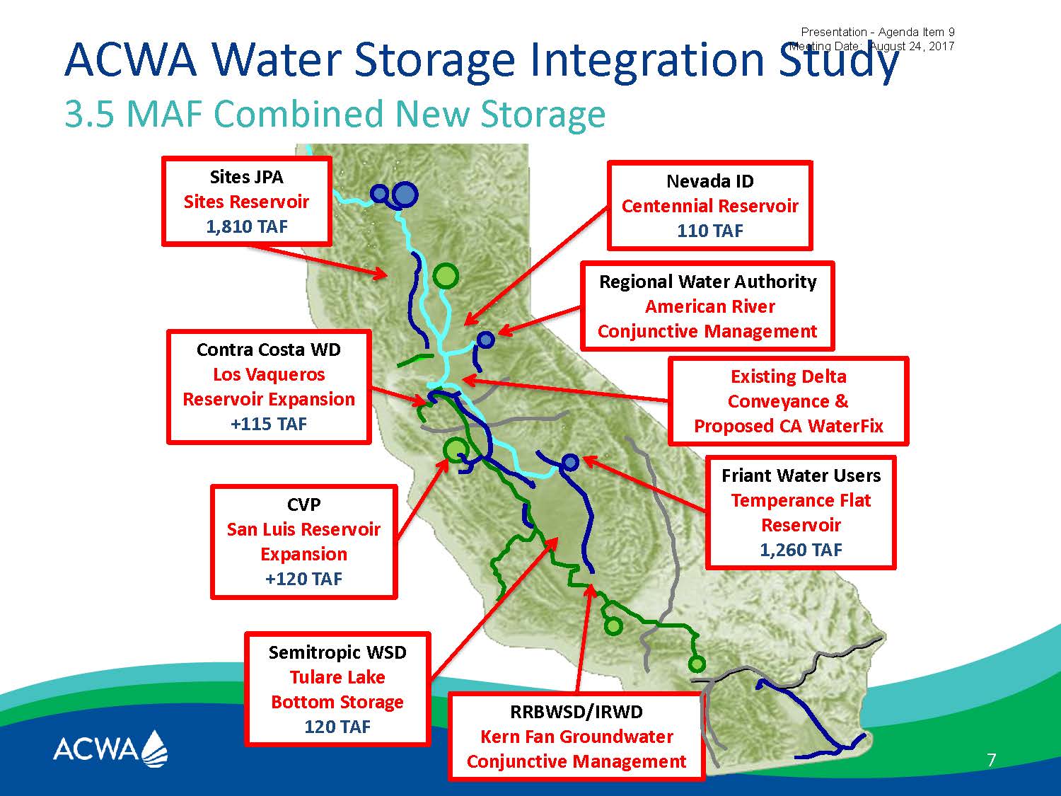 “The study was prepared by MBK Engineers for ACWA, and is one of the only storage studies which analyzes the integration of existing and potential new storage projects and their operations,” said Anthony Navasero, Senior Engineer with the Delta Stewardship Council. “This study is another tool to assist decision makers to evaluate and prioritize storage projects and their benefits.”
