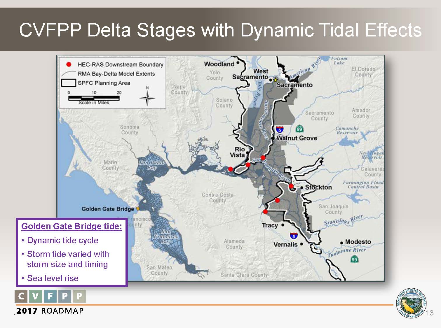 The CVFPP update worked to address the concurrence of sea level rise and base impacts of storm surge, concurrent with flood waters coming through the system. This graphic here depicts some of the modeling technique where they looked at the Golden Gate and incorporated future mid and late century sea level rise projections to describe what the backwater effects would be when floodwaters would be moving through the system, he said.