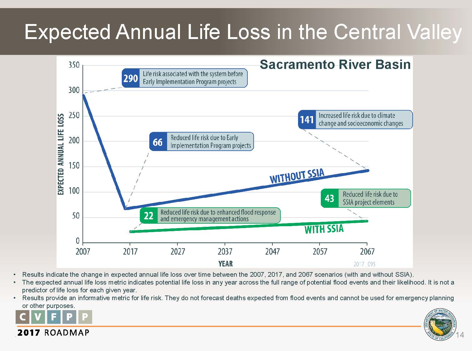 “With some of the work that we’re doing now, the expected annual life loss has dropped down to about 22,” he continued. “Now as the population continues to grow, those numbers with or without the CVFPP will increase, and so the investments that are envisioned within this 2017 update can drop that expected increase from 141 down to 43 lives per year. The numbers for the San Joaquin Basin are actually much more optimistic, where the CVFPP can actually reverse the future trends of expected life loss there.”