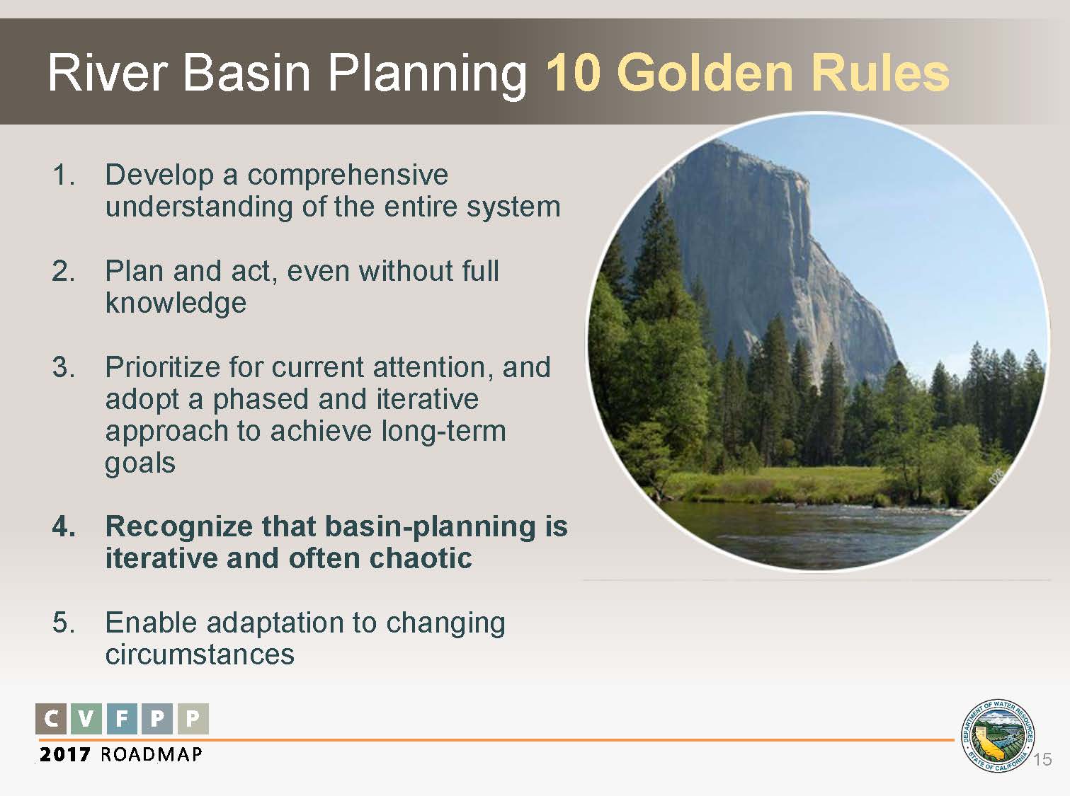 Mr. Mierzwa said the conceptual basis for the plan were the River Basin Planning 10 Golden Rules, which were based of a UNESCO document on good planning principles and policies. “Two that I really wanted to call out to attention here is a recognition that planning processes are often iterative and chaotic; that is the logic in having a 5-year update to the CVFPP and the reason why my team is already working on scoping out the 2022 CVFPP,” he said.