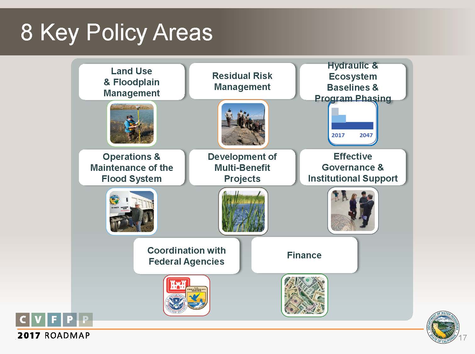 The plan identifies 8 key policy areas: land use and floodplain and management policies and recommendations; residual risk management policies; hydraulic and ecosystem baselines and program phasing considerations; operations and maintenance of the flood system; the need for the development of multi-benefit projects in the Central Valley; effective governance and institutional support; coordination with federal agencies; and finance.